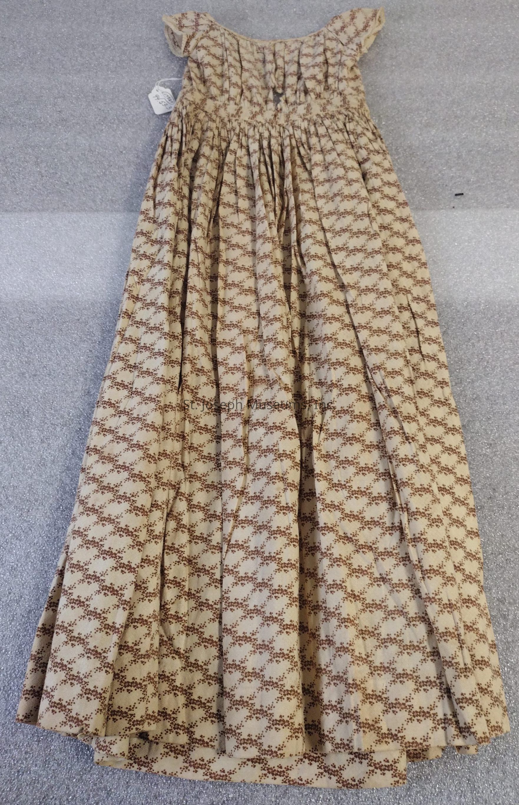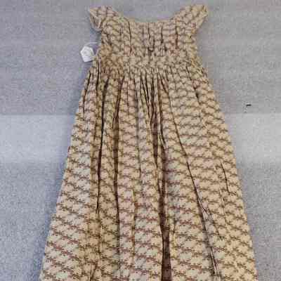 Dress/child's/cotton/beige background with small, brown, floral design/lace around sleeves/gathered waist/hole size of silver dollar in front