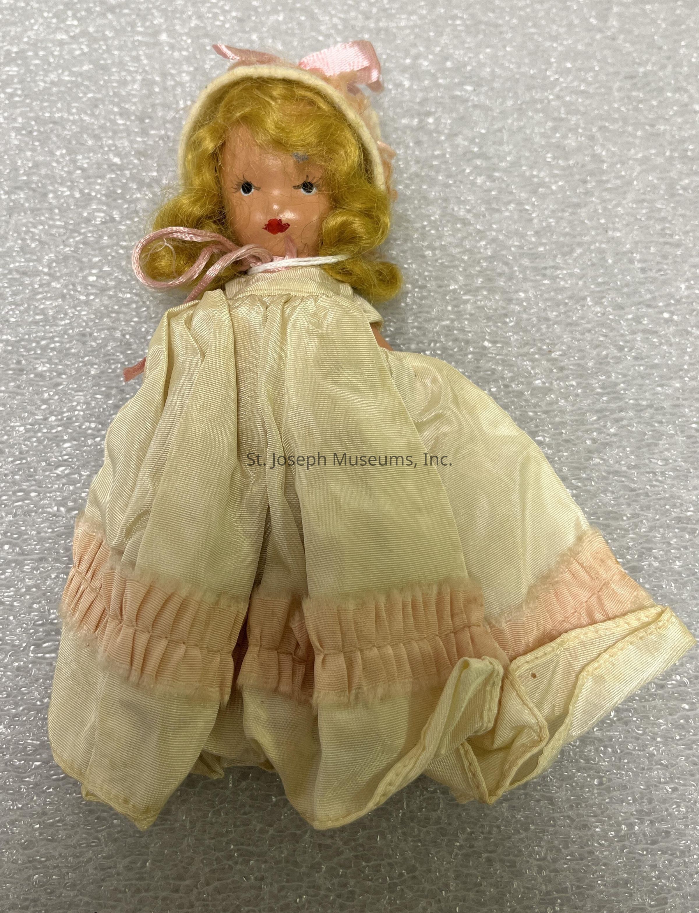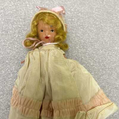 Nancy Ann Story book doll. Has blonde hair and is wearing an ivory dress and hat with pink trim.