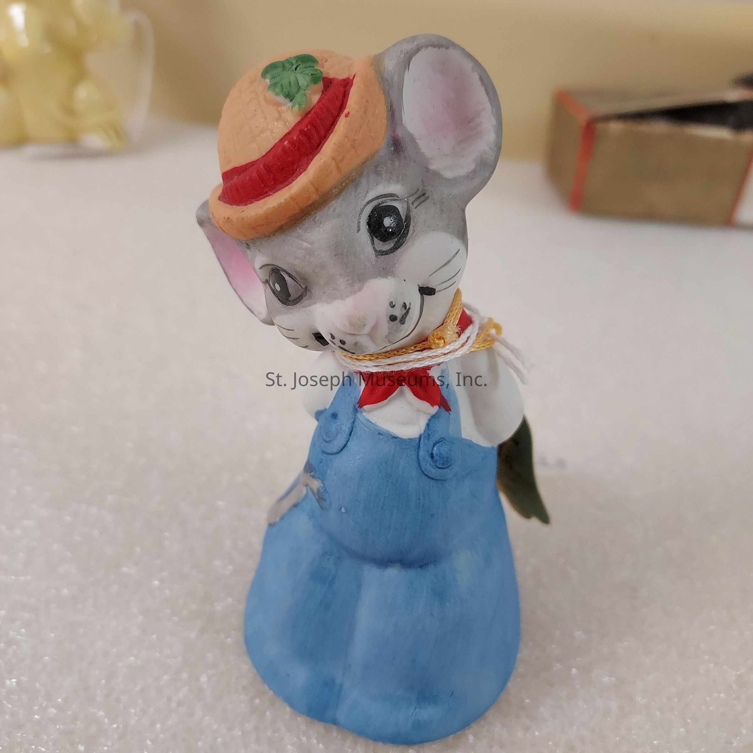 A Grey ceramic mouse bell with a yellow straw hat with a red ribbon and a 4 leaf clover. Mouse is also wearing blue overalls and a red scarf.