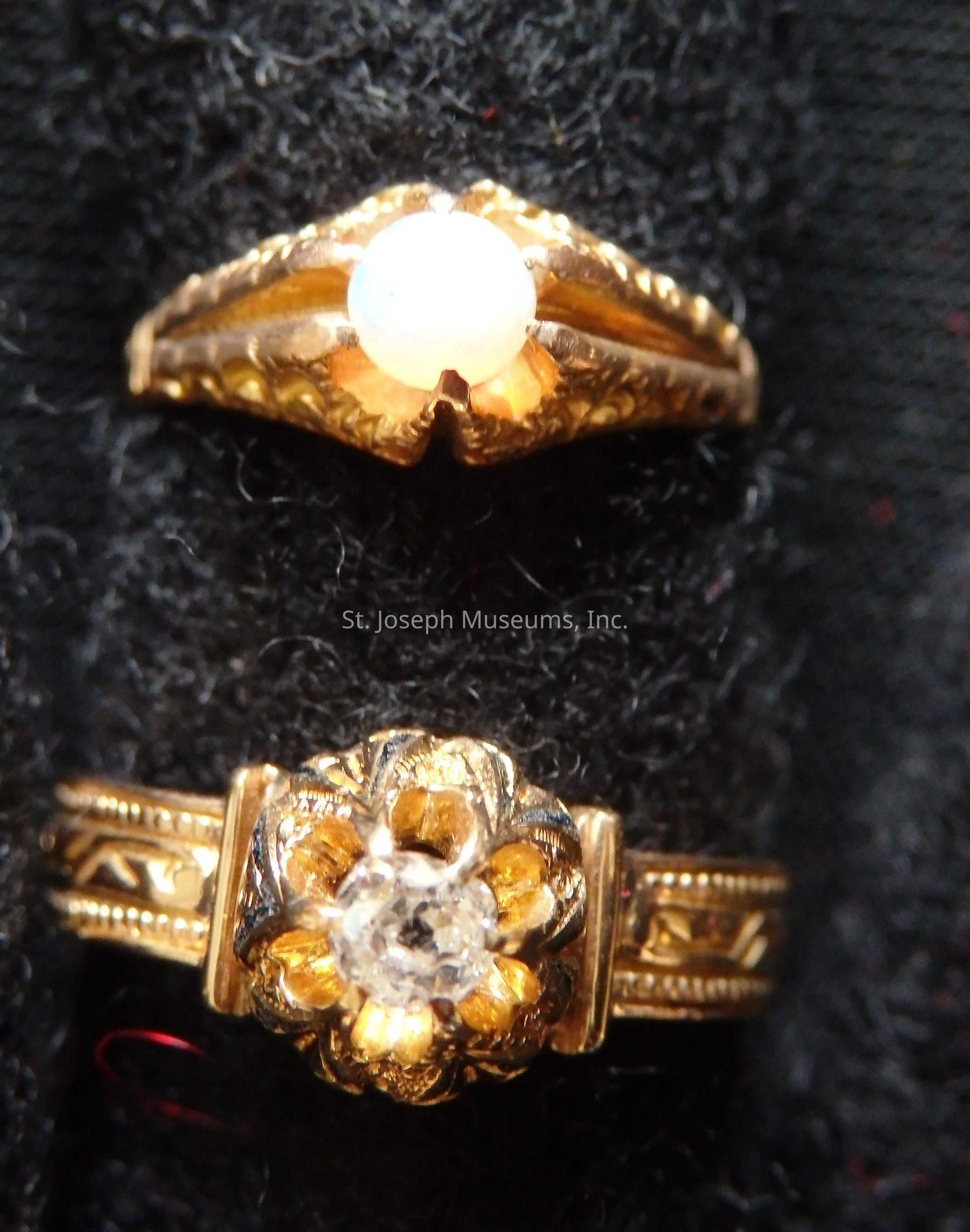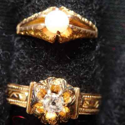 Two gold rings, one with a small diamond, the other with a small opal. Neither of these two rings has any insciption or monogram.