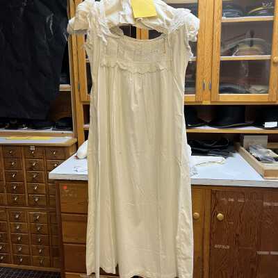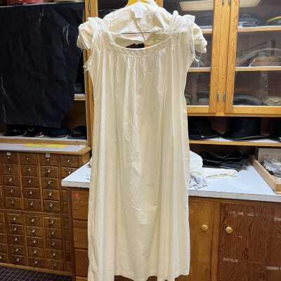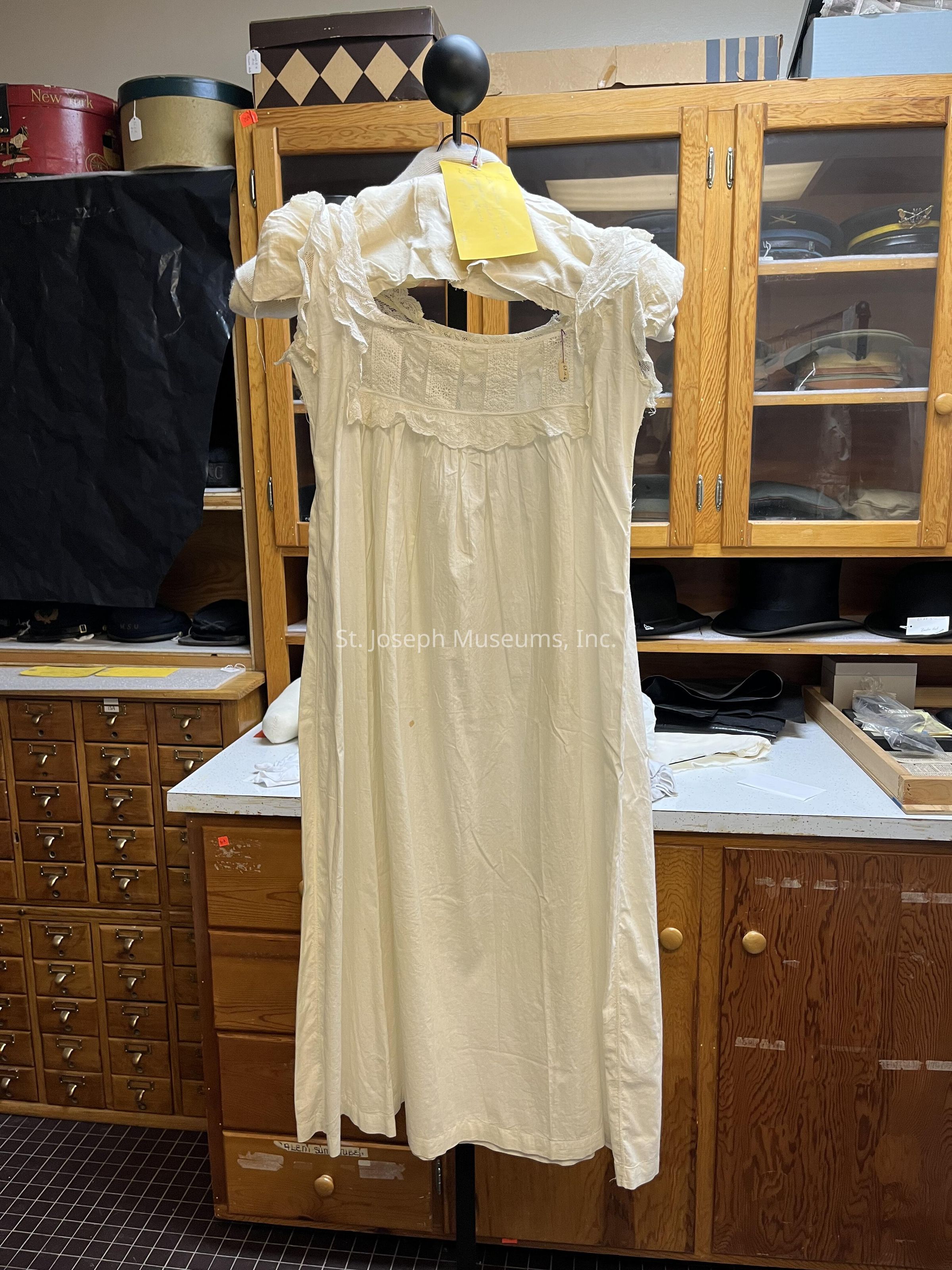The image showcases a white lace nightgown with lace detailing at the bodice and neckline.