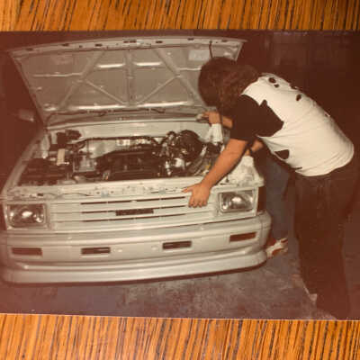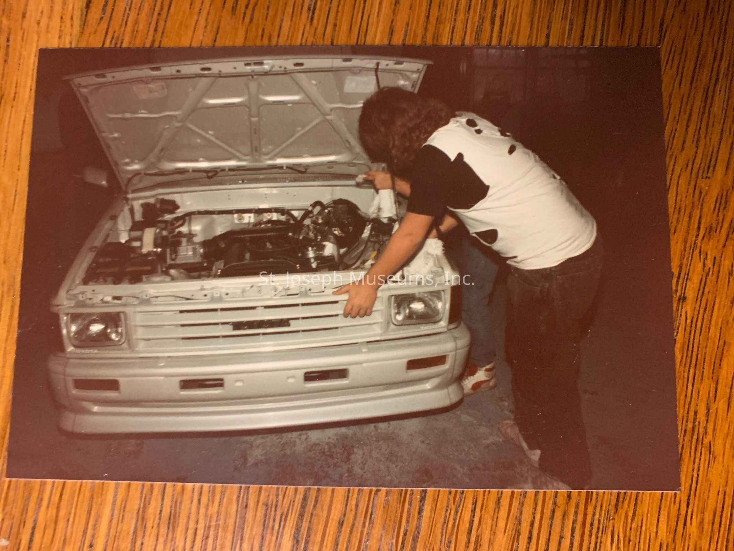 Jukebox Hero Project in Garage, Woodson Unit, 1989. Finished Juke Box Hero in the garage with two people looking over the engineCollection