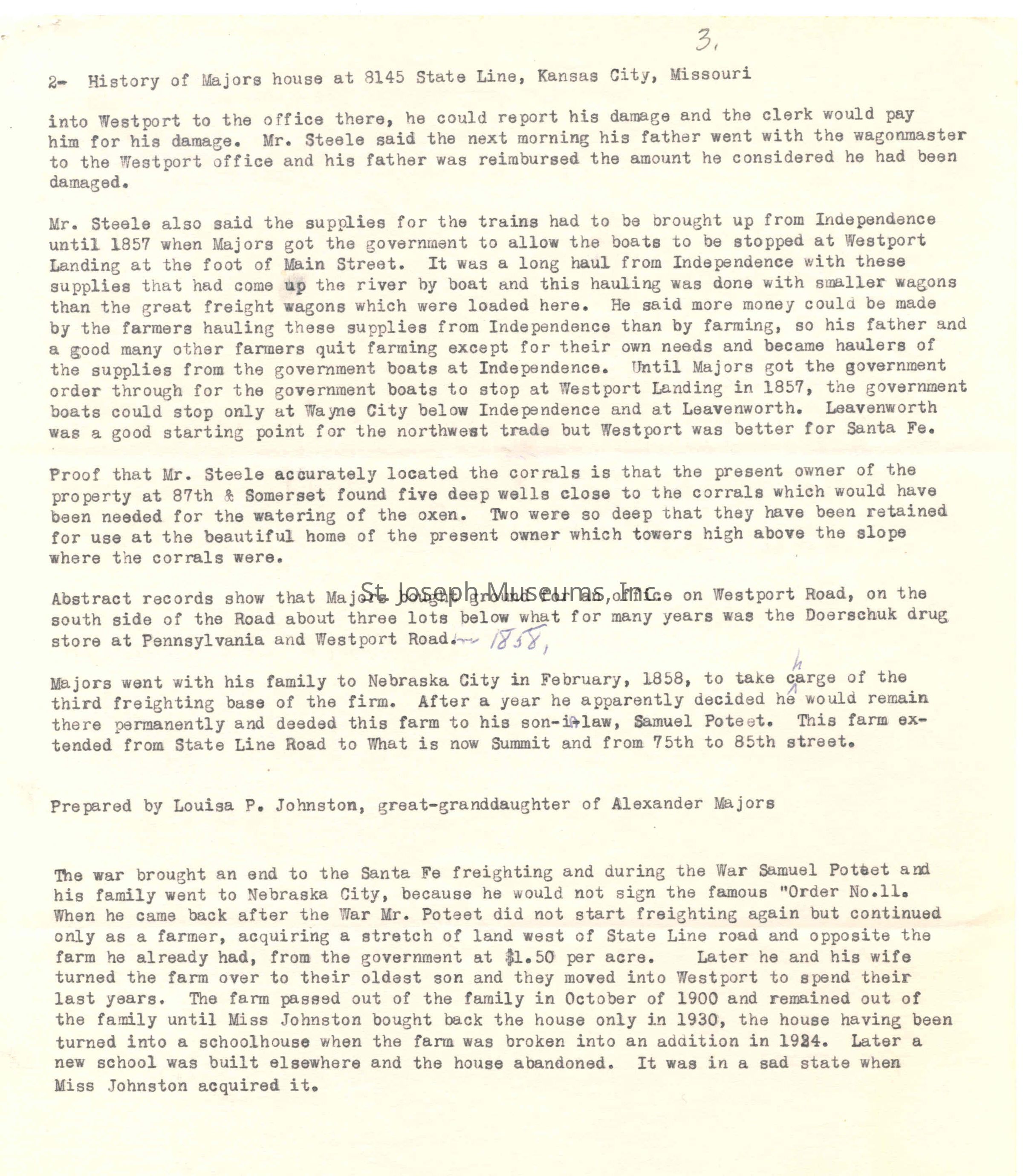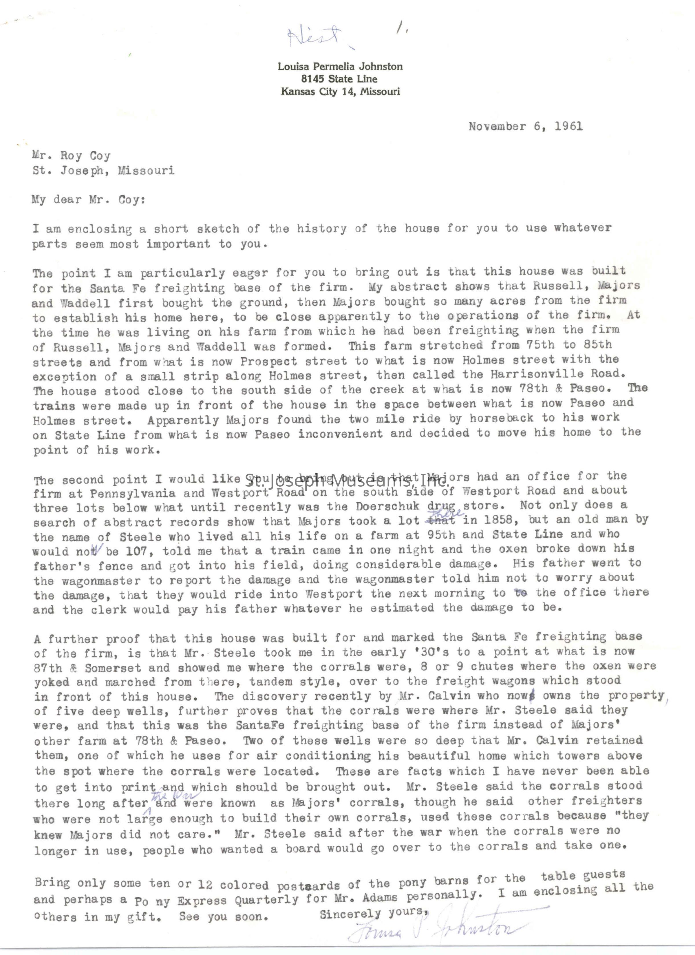 Johnston,Louisa-letter MajorsHome in KCEntry/Object ID