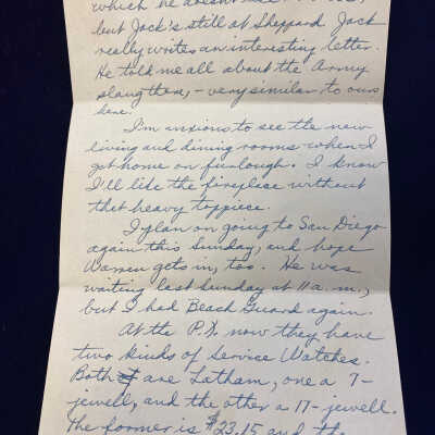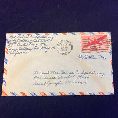 Handwritten letter home to parents back in St. Joseph after being called up to serve in the US Army during WWII. Pvt. Spalsbury, at the time of this letter, is at Camp Callen, California for Basic Training. The letter is three pages, front & back, written in blue ink pen on plain stationery. The letter was mailed in an Air Mail specific envelope with the red and blue hash mark edges. The stationary fits the envelope with regular folding.Condition
