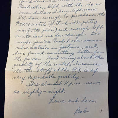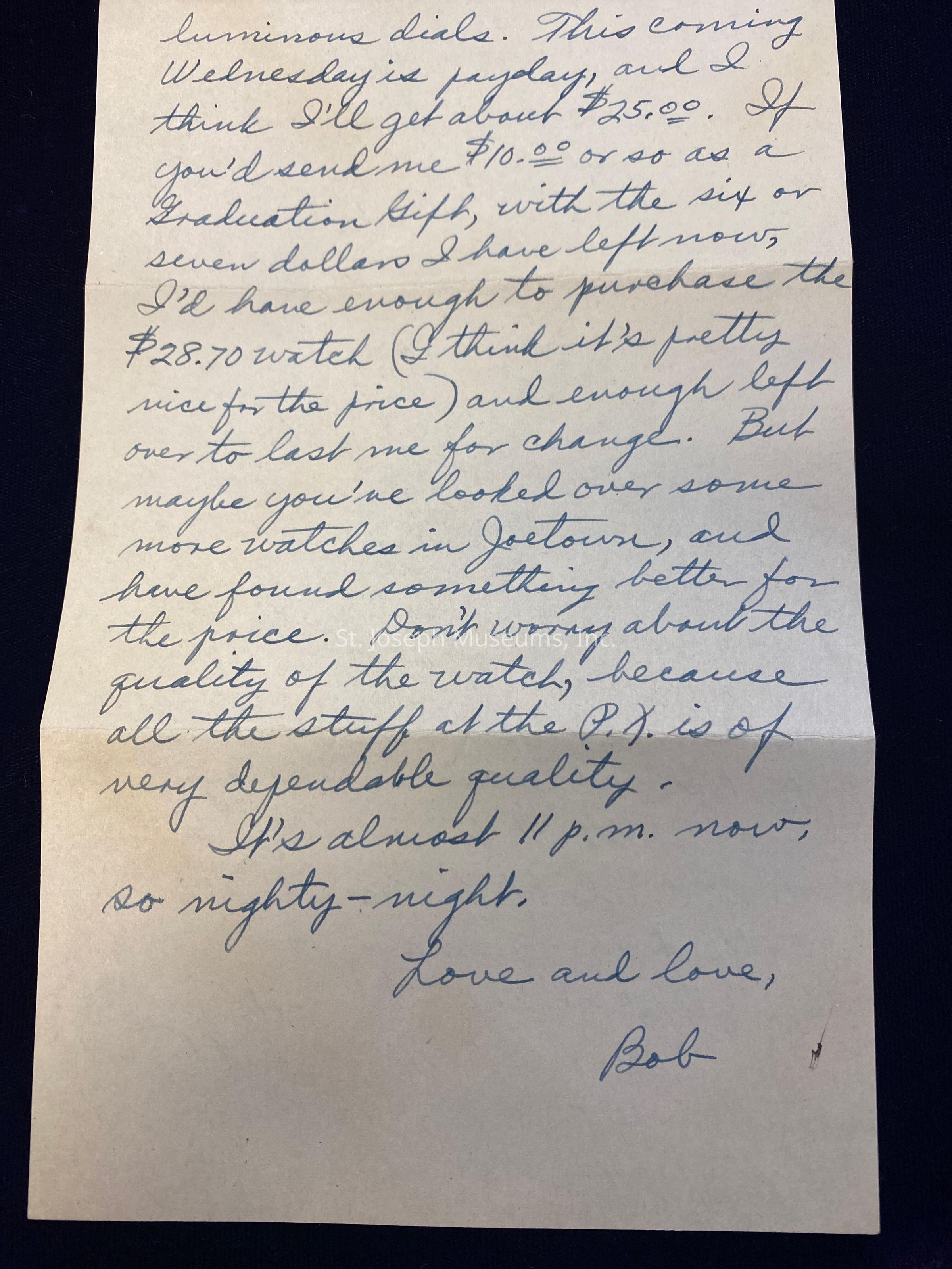 At the P.X. now they have two kinds of Service Watches. Both are Latham, one a 7 - jewell, and the other a 17 - jewell. The former is $23.15 and the latter is $28.70. They are both waterproof, I believe and have luminous dials. This coming Wednesday is payday, and I think I'll get about $25.00. If you'd send me $10.00 or so as a Graduation Gift, with the six or seven dollars I have left now, I'd have enough to purchase the $28.70 watch (I think it's pretty nice for the price) and enough left over to last me for change. But maybe you've looked over some more watches in Joe town, and have found something better for the price. Don't worry about the quality of the watch, because all the stuff at the P.X. is of very dependable quality.