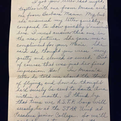 I got your letter last night, together with one from Duane and one from Barbara Mann. My, but she answered my letter quickly, compared to how quickly I answered hers. I must answer this one in the near future. She gave me a compliment for you, Marie. She said she thought you were "very pretty and seemed so sweet." But of course that was just her first impression. Ha! In Duane's letter he told me about the thrill of flying, and how he thought he'd surely be sent to Santa Ana within a month. I think by that time we A.S.T.P. boys will surely be at the STAR unit at Pasadena Junior College. So we'll probably get to see each other sometime soon.