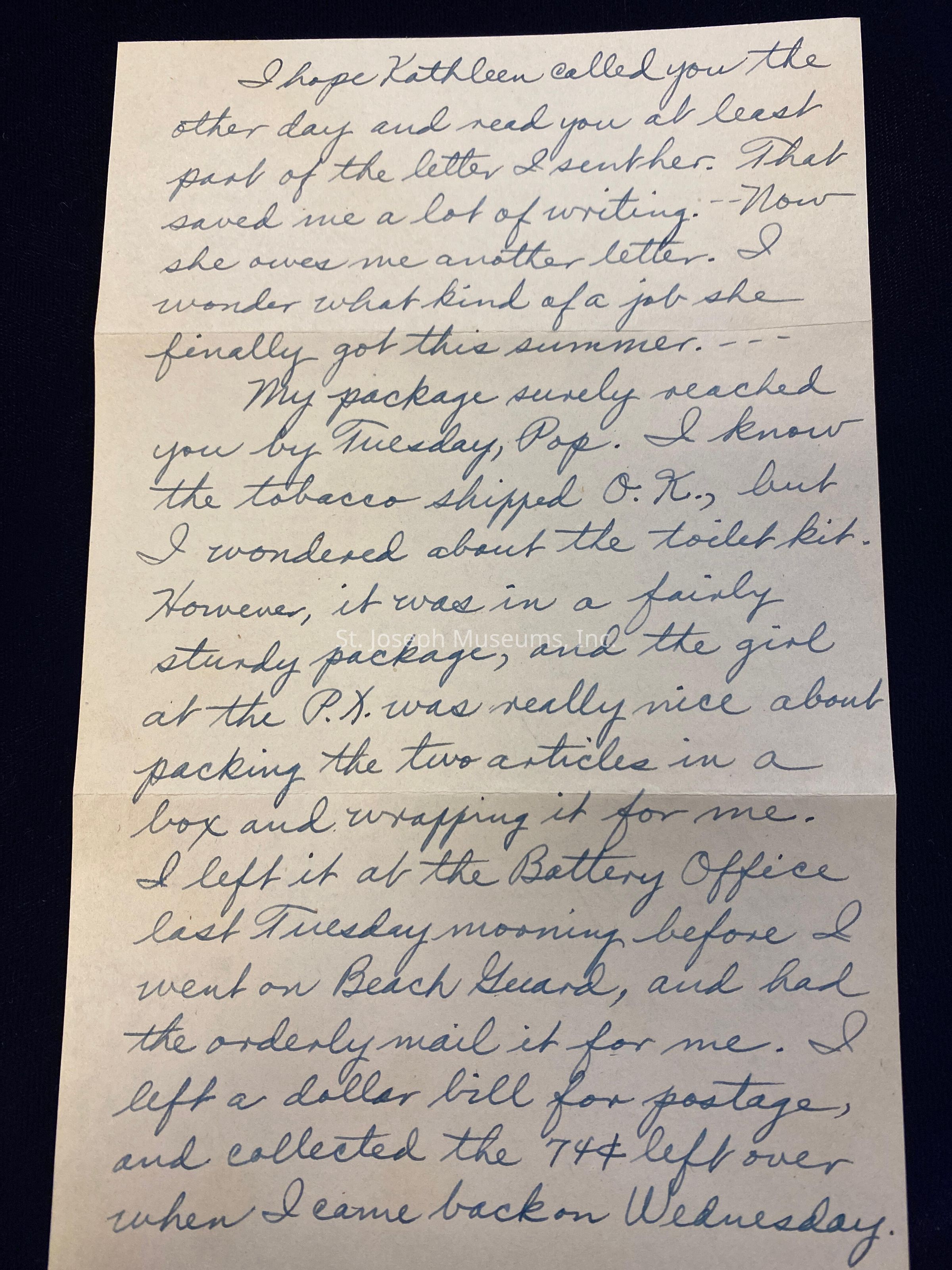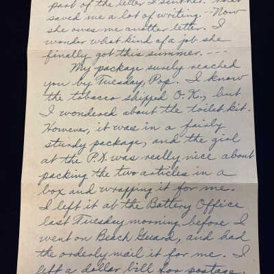 My package surely reached you by Tuesday, Pop. I know the tobacco shipped O.K., but I wondered about the toilet kit. However, it was in a fairly sturdy package, and the girl at the P.X. was really nice about packing the two articles in a box and wrapping it for me. I left it at the Battery Office last Tuesday morning before I went on Beach Guard, and had the orderly mail it for me. I left a dollar bill for postage, and collected the 74 cents left over when I came back on Wednesday.