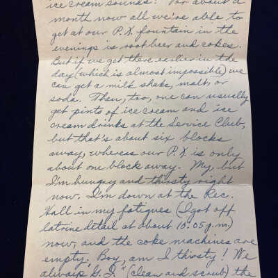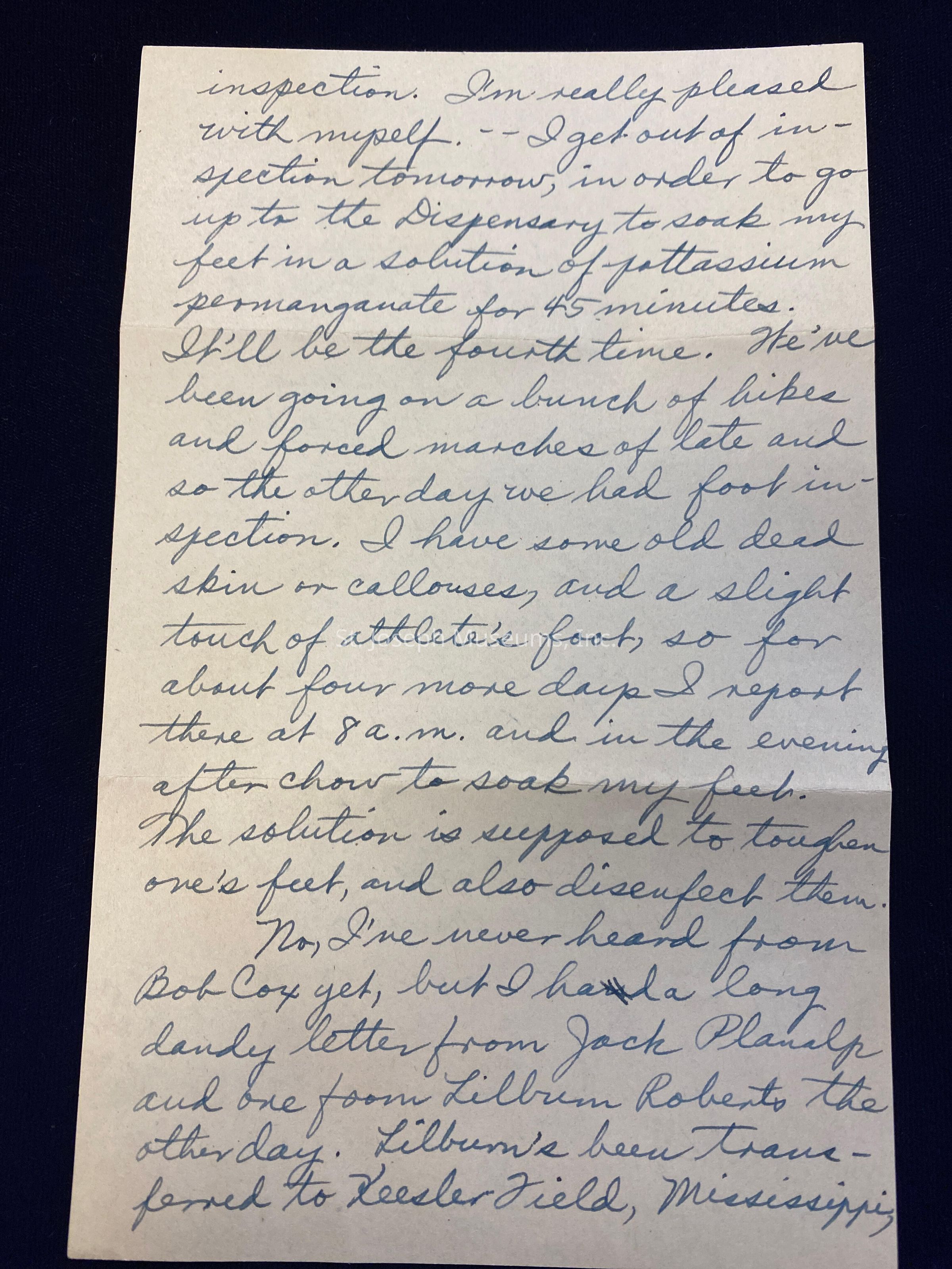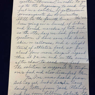 My, how good that raspberry ice cream sounds! For about a month now all we're able to get at our P.X. fountain in the evenings is root beer and cokes. But if we get there earlier in the day (which is almost impossible) we can get a milk shake, malt or soda. Then, too, one can usually get pints of ice cream and ice cream drinks at the Service Club, but that's about six blocks away, where our P.X. is only about one block away. My, but I'm hungry and thirsty right now. I'm down at the Rec Hall in my fatigues (I got off latrine detail at about 10:05 p.m.) now, and the coke machines are empty. Boy, am I thirsty! We always G.I. (clean and scrub) the barracks Friday nights in preparation for Saturday morning's inspection. I'm really pleased with myself. - - I get out of inspection tomorrow, in order to go up to the Dispensary to soak my feet in a solution of potassium permanganate for 45 minutes. It'll be the fourth time. We've been going on a bunch of hikes and forced marches of late and so the other day we had foot inspection. I have some old dead skin or callouses, and a slight touch of athlete's foot, so for about four more days I report there at 8 a.m. and in the evening after chow to soak my feet. The solution is supposed to toughen one's feet, and also disinfect them.