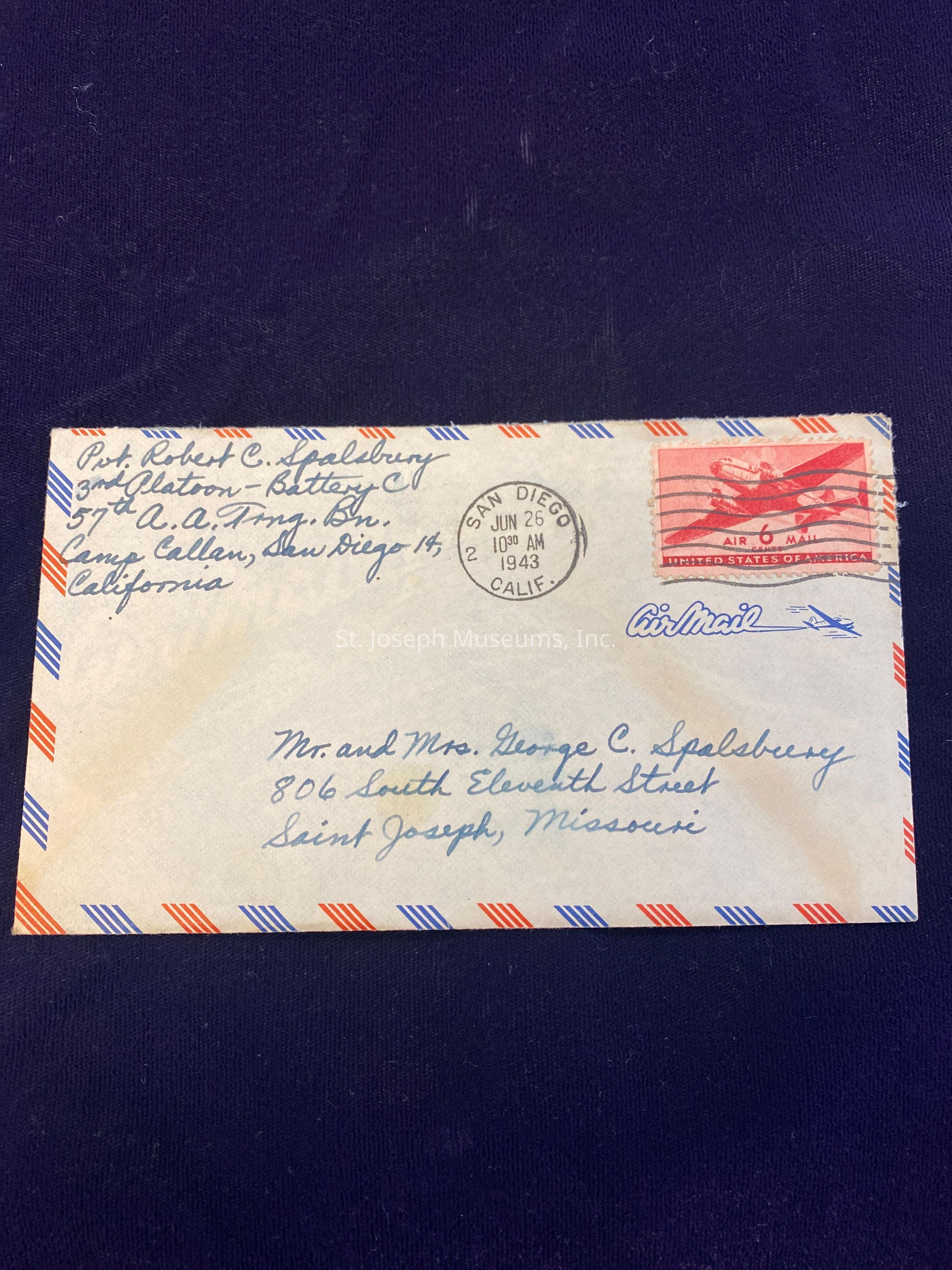 Letter Home from US Army Pvt. Robert C. Spalsbury, 3rd Platoon-Battery C, 57th A.A. Trng. Bn., Camp Callan, California to his parents, Mr. & Mrs. George C. Spalsbury, 806 South Eleventh Street, St. Joseph, Missouri - Postmarked June 26, 1943, 10:30 AM San Diego, CALIF, 6 cent Air Mail stampDescription
