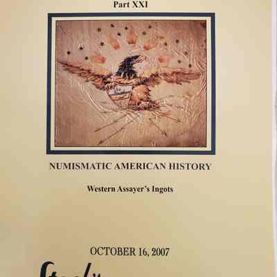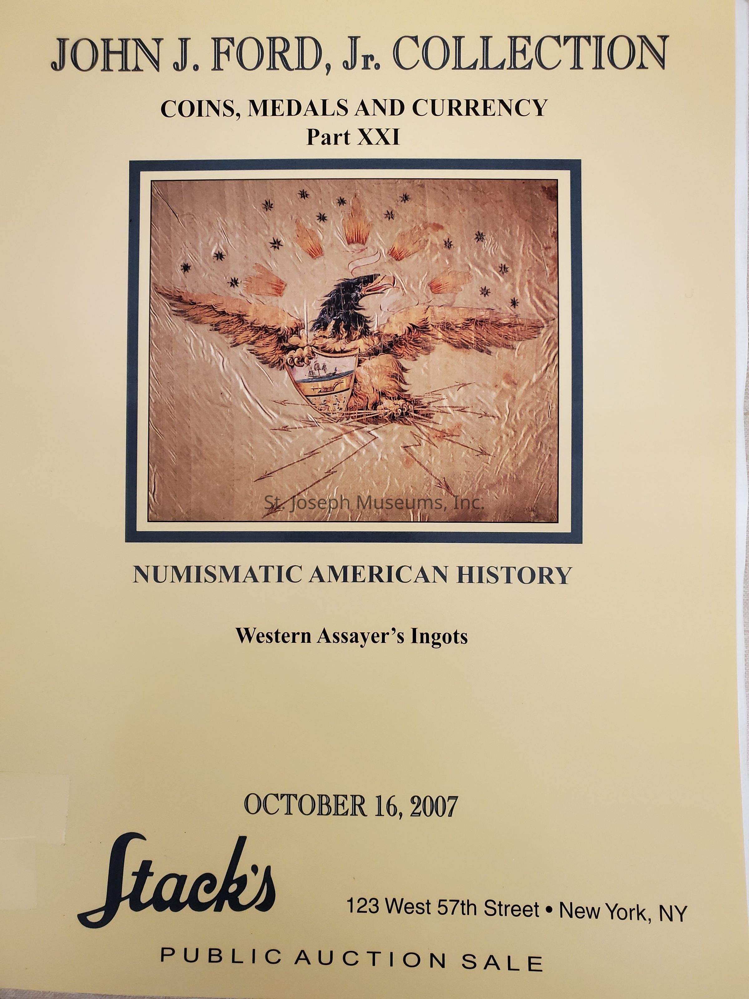 John J. Ford, Jr. Collection, Coins, Medals and Currency, Part XXI, a catalog for the sale of this collection: Numismatics American History, Western Assayer's Ingots. This part Part 21 of the John J. Ford, Jr. Collection, lots 3501-3560, was sold following the sale of Part 20 of the John J. Ford, Jr. Collection, lots 3001-3395, presented in a separate catalogue,, PLEASE NOTE: there are no lots 33963500." The auction was held October 16, 2007.