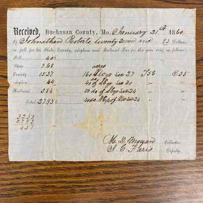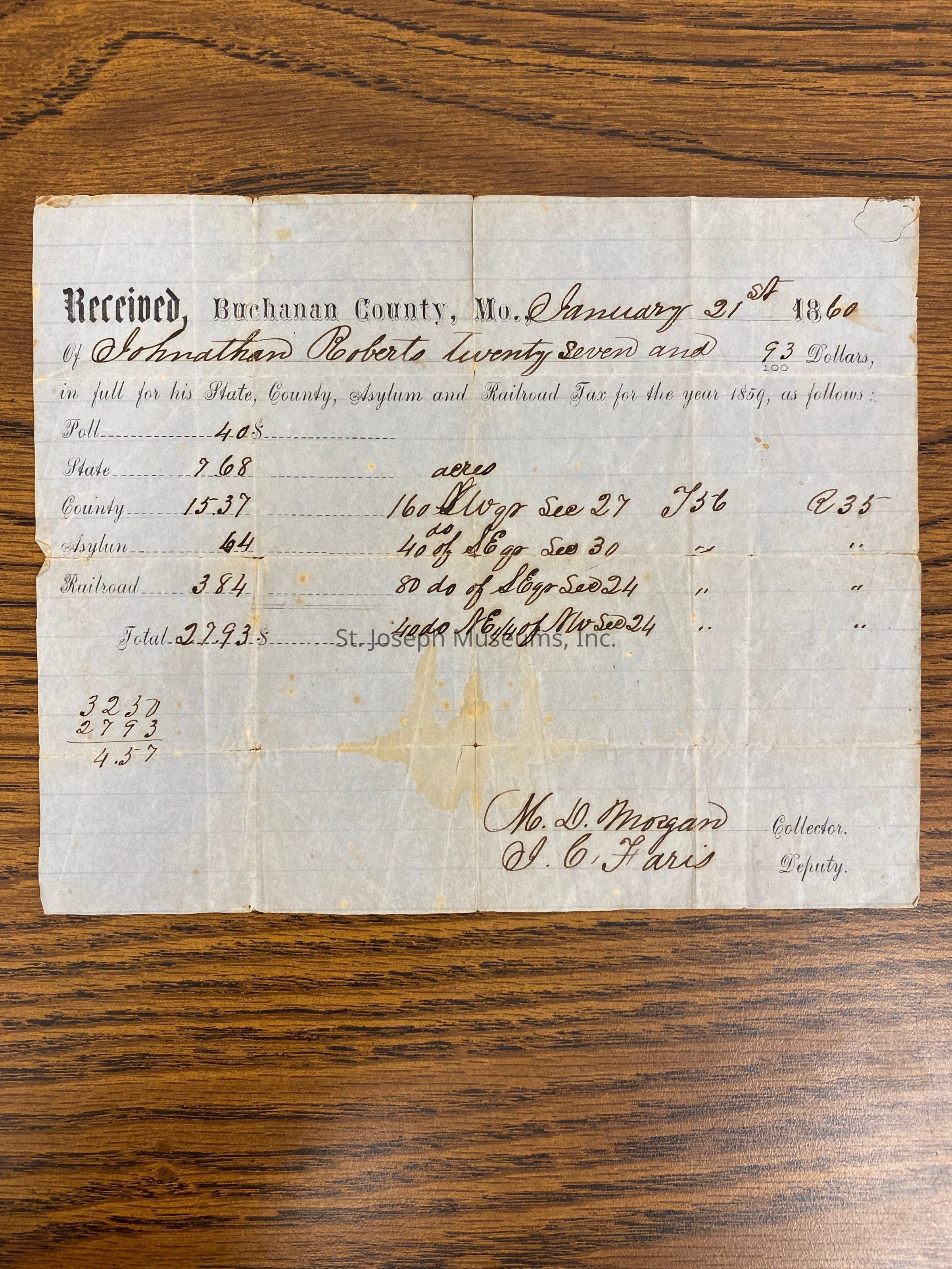 Receipt for property taxes for the year 1859 in the amount of $27.93 received from Jonathan Roberts, paid to Buchanan County, Missouri, dated January 21, 1860. Spelling as on paper.Lexicon