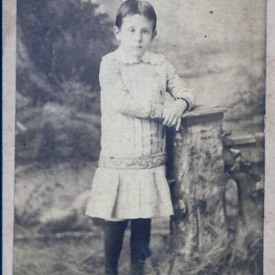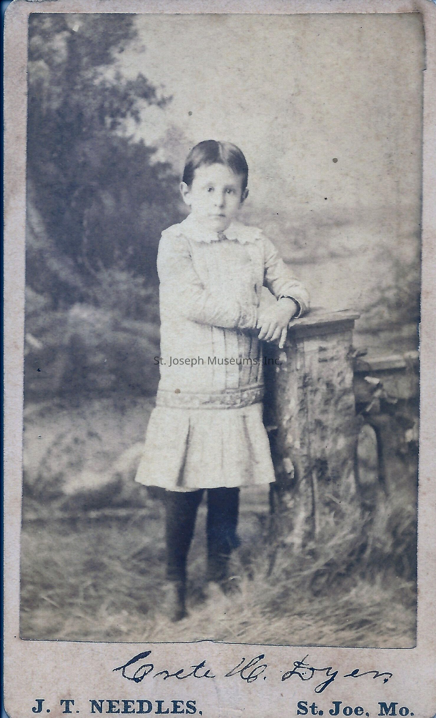 Doyen, Crete W: Needles Photographers Photo, undated. c. 1875 Cartes de visite image from J.T. Needles studio in St. Joseph. On bottom: "J. T. Needles, St. Joe, Mo." Photo of boy about age 5, in light pleated dress, black leggings. standing leaning on stump, with scenery background. Handwritten at bottom: Crete W. Doyen.Collection
