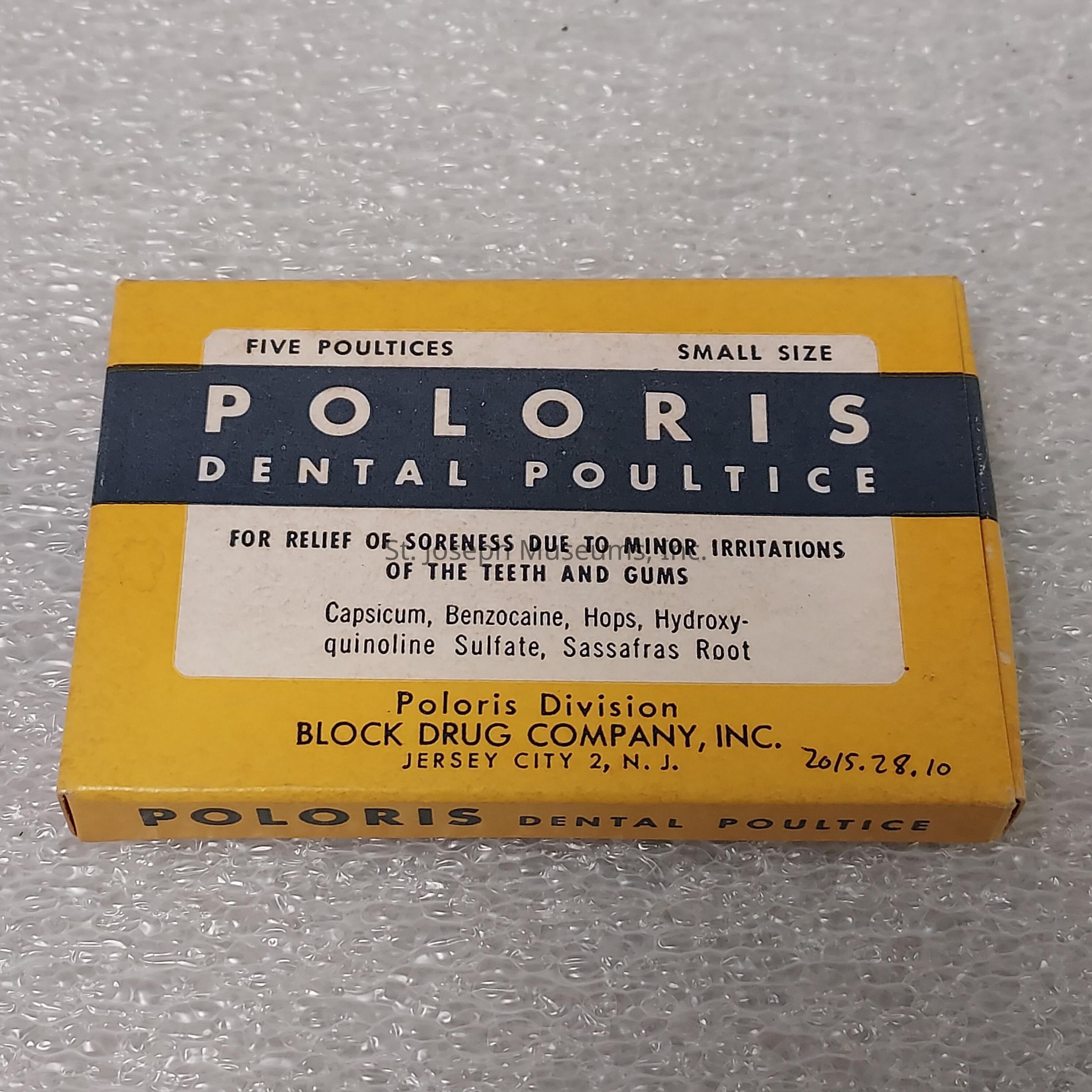 Box/Cardboard/Yellow, white, and purple/ "Poloris Dental Poultice Five Poultices Small Size for relief of soreness due to minor irritations of the teeth and gums Capsicum, Benzocaine, Hops, Hydroxyquinoline Sulfate, Sassafras Root Poloris Division Block Drug Company, Inc. Jersey City 2, N.J."/Contains five poultices wrapped in paper/3.25"x2"x0.25"Collection