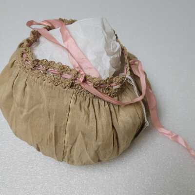 CLOTH/CROCHET SQUARE ON BOTTOM/CROCHET TRIM AT TOP/PINK RIBBON DRAWSTRING/ DIRTY