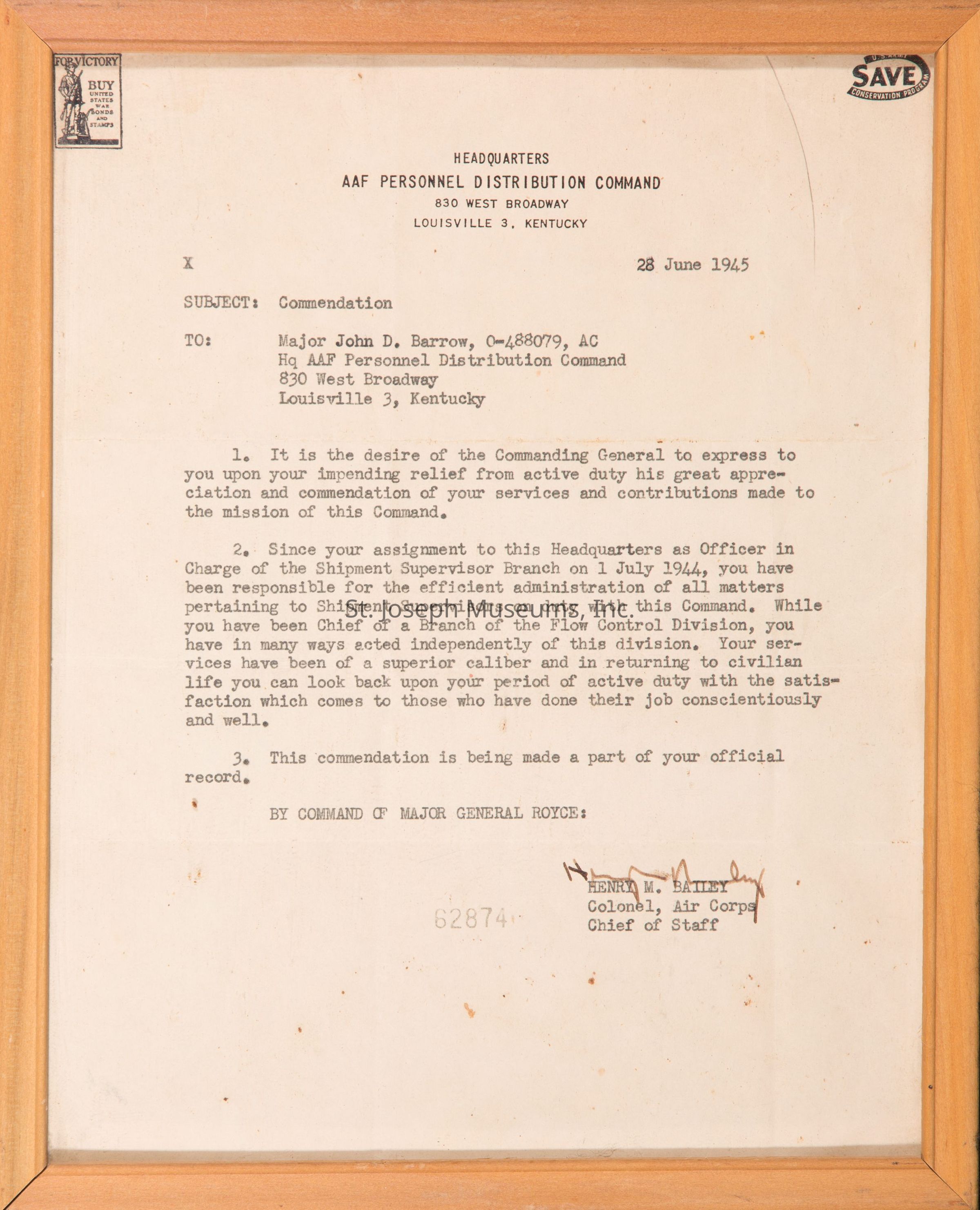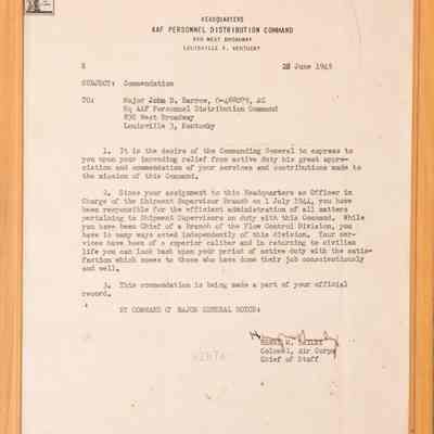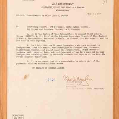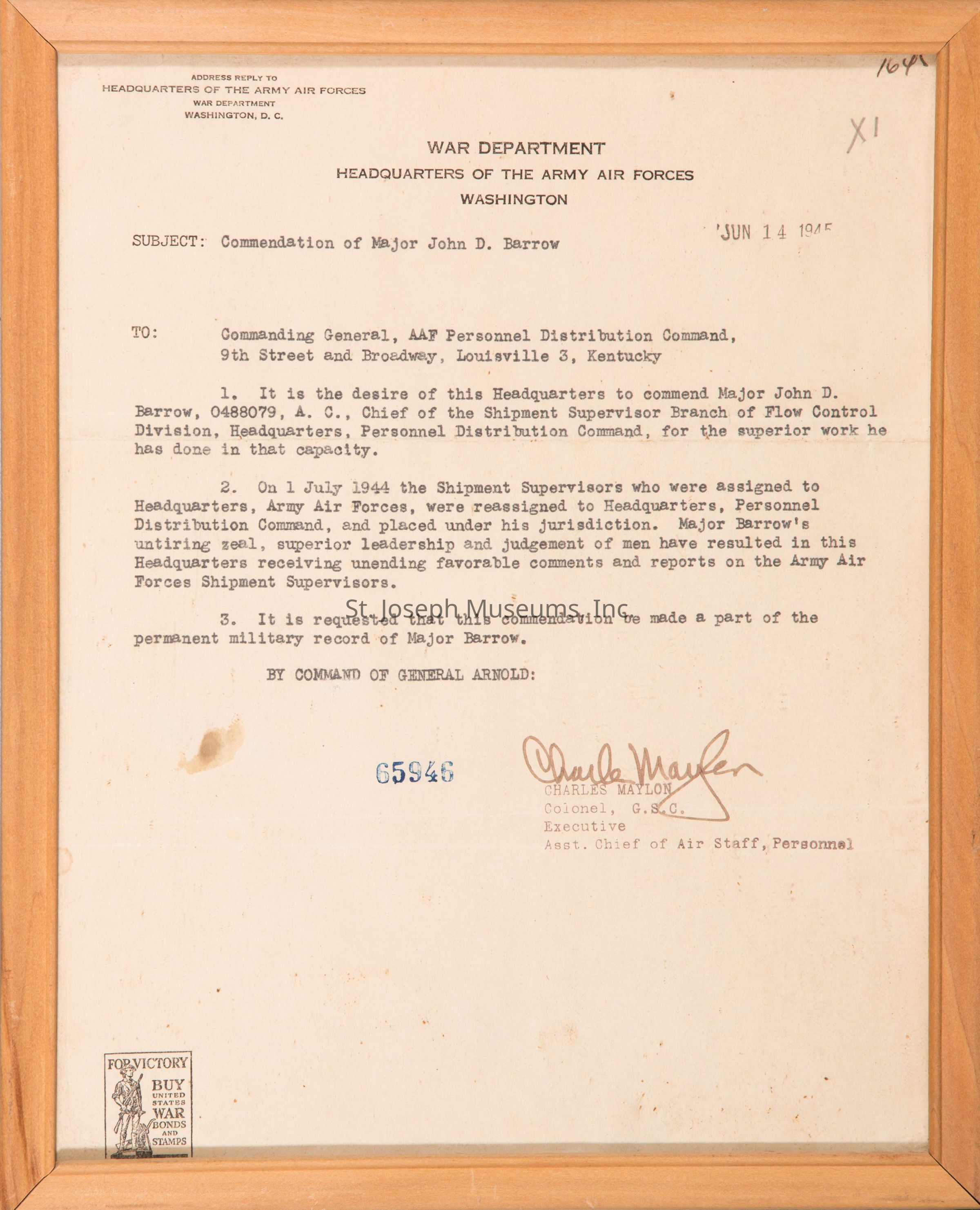 Commendations from the U.S. War Dept. to Major John D. Barrow.