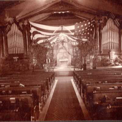 Duncan-McCaskey Wedding Chapel Photo, undated. Church Sanctuary with front alcove decorated with large U.S. flags for the wedding of Emma Donovan & Douglas McCaskey at Christ Episcopal Church in St. Joseph. Emma is daughter of John Donovan, General Manager of St. Joseph Stockyards. Sepia. Same photo as 89.35.2.