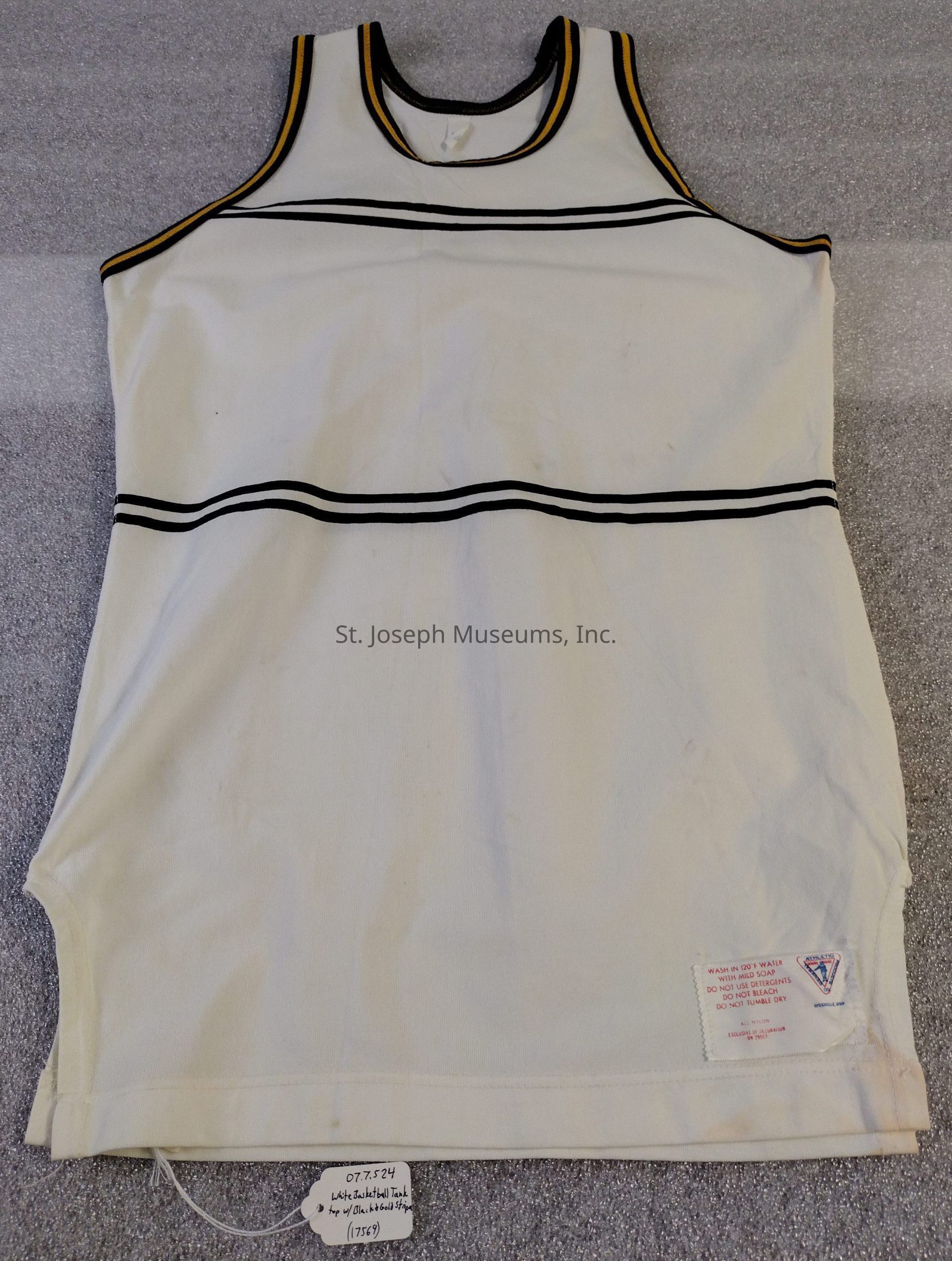 Basketball Tank Top/White with Two Rows of Two Black Stripes around Chest, Stomach, and Back/Black and Gold Stripes around Collar and Arms/Tag/ "Size 38"/31"x18 ½".