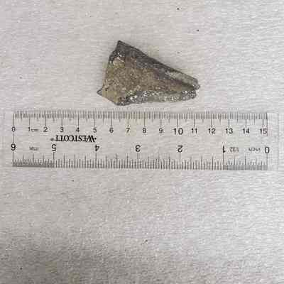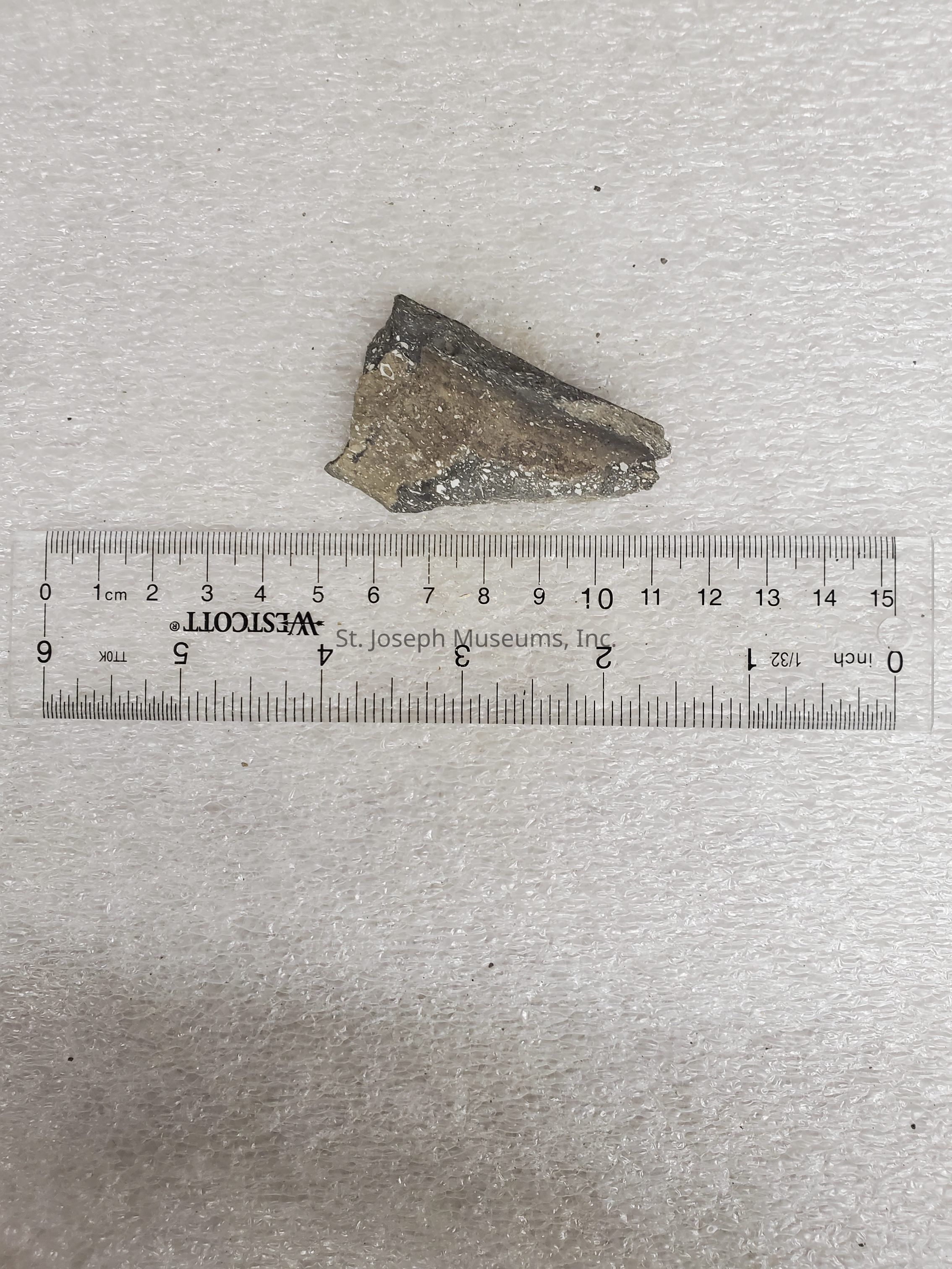 Tan-grey color / curved piece / incised geo. design on inside of rim / plain