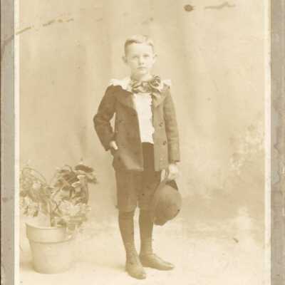 Farris, Fred: Bigelow's Central Gallery Photo, undated, c. 1895. Photo from Bigelow's studio in St. Joseph, matted on cardboard. Photo of boy about age 7 in dark suit with short pants, ruffled white collar, leggings, holding hat in his left hand, standing next to potted plant, full view. Handwritten on back: Fred Farris. At bottom: "Bigelow's Central Gallery, 4th & Edmond, St. Joseph, Mo."Collection