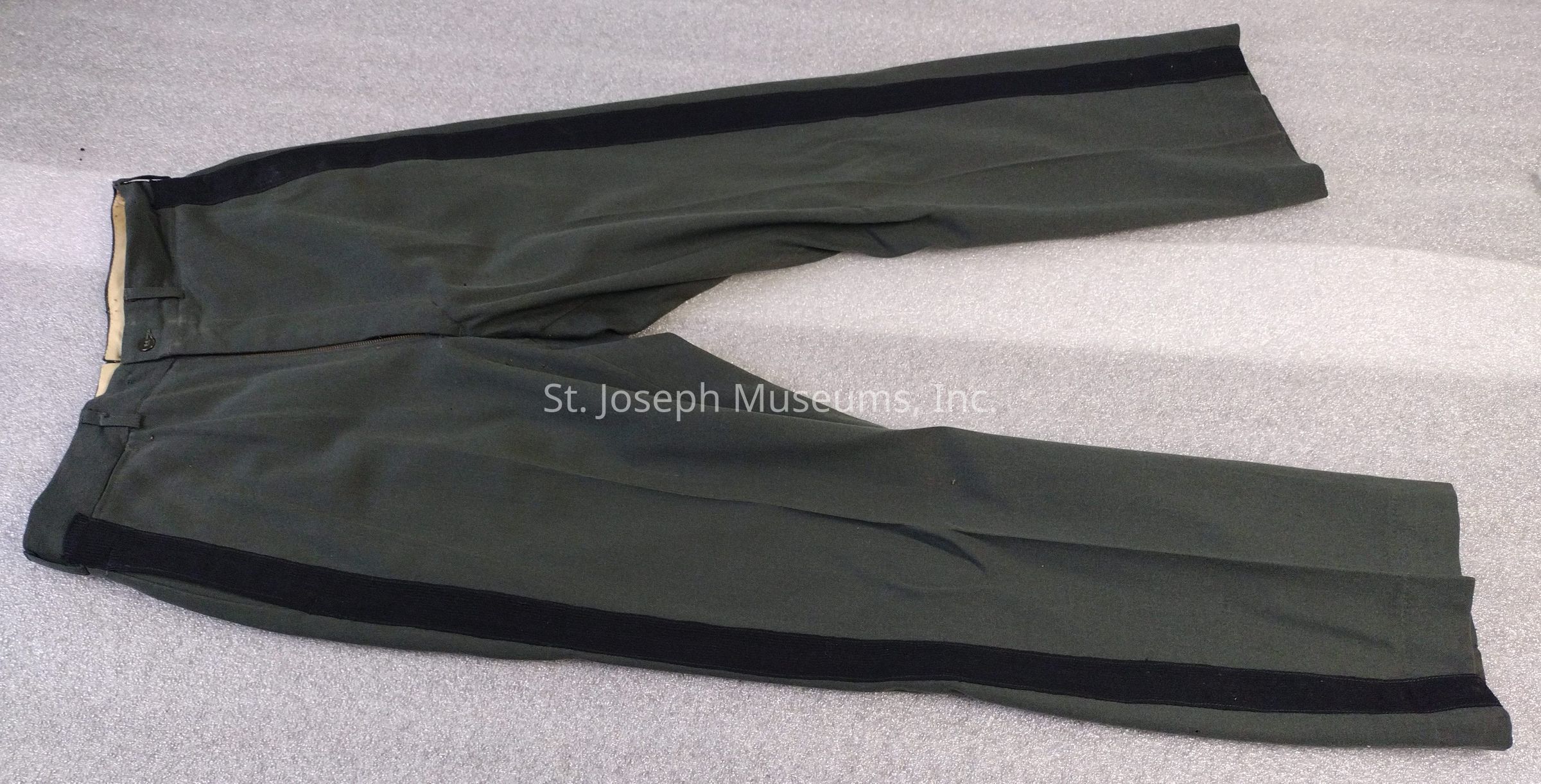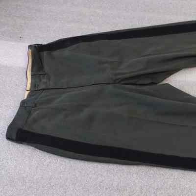 The image shows a pair of military uniform pants in green, featuring a distinctive black stripe running down each leg.