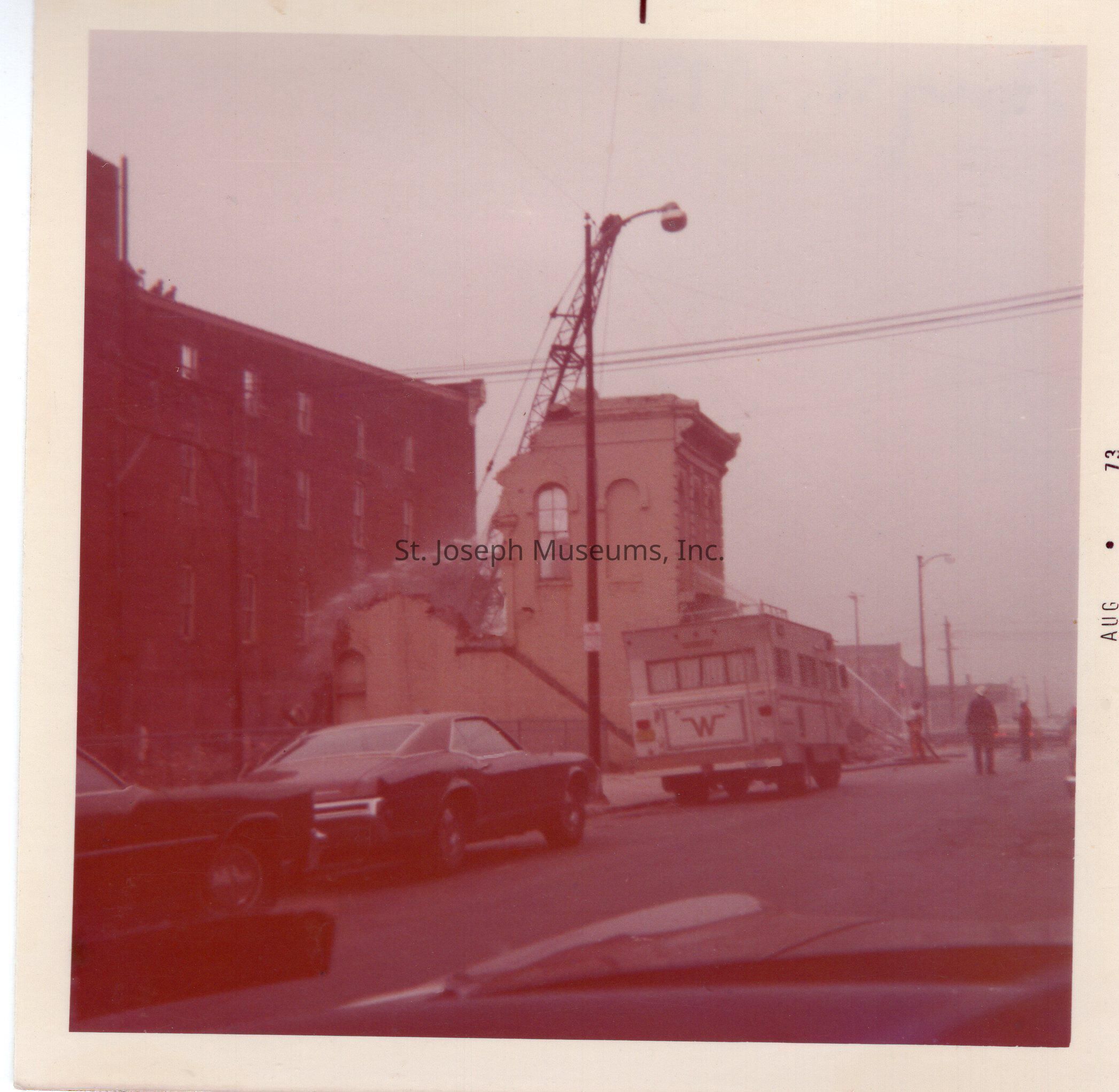 Downtown Area, Buildings Razed, Unidentified Street, Snapshot, 1973. color. View of building in process of being knocked down by crane. The shot is either of a eastbound or northbound one-way street in downtown area. It may be Fifth St.??Collection
