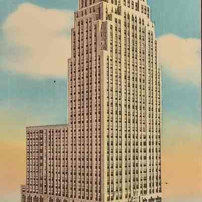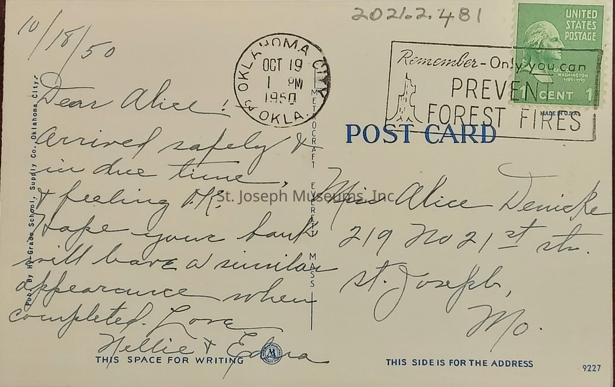Handwritten postcard, from Nellie & Edna to Miss Alice Denicke, 219 No 21st sts., St. Joseph, Mo., postmarked Oct 19 1950, Oklahoma City, Okla., postage 1¢ stamp. The front of the card is a colored picture of the First National Bank And Trust Co., Oklahoma City, Okla.Context