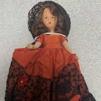 Nancy Ann Storybook Doll with brown hair. Wearing a red dress with black lace trim and a black lace veil.