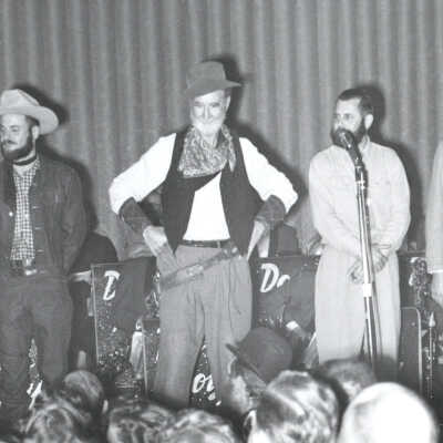 96.1P.1 = Six men lined up on stage wearing western attire of the period and sporting beards. "Finalists in the Whisker contest, Pony Express Centennial Ball, Froghop Ballroom, April 2, 1960"