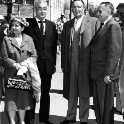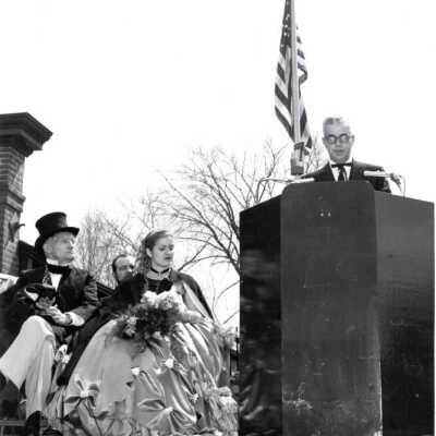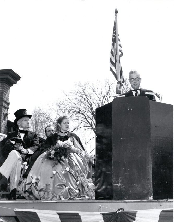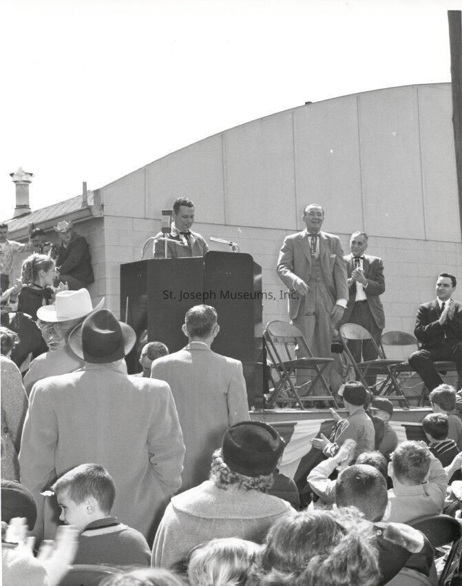 96.1P.2 = Pony Express Centennial Ceremony, April 3, 1960. "Congressman William Hull at Speaker's stand. L. to R.: Bartlett Boder, President, Historical Society; Mayor Arthur Meers, and Maryon Kay Derc, Centennial Queen." (a third man at extreme left unidentified).