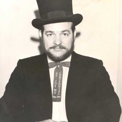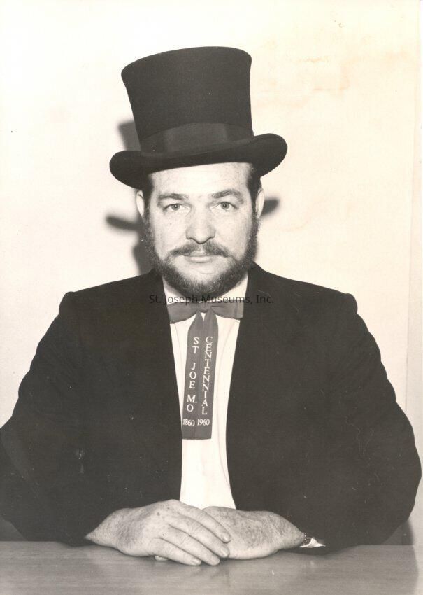 96.1P.4 & 5 = Mayor Arthur J. Meers, in period suit with top hat. His "string" tie is embossed St. Joe, MO, Centennial, 1860, 1960.