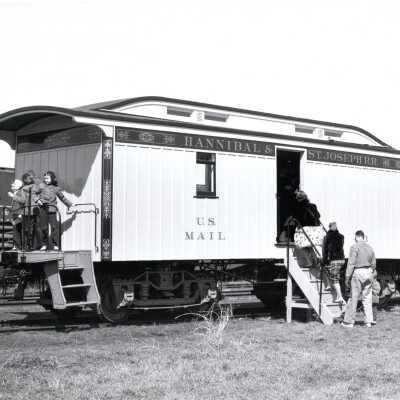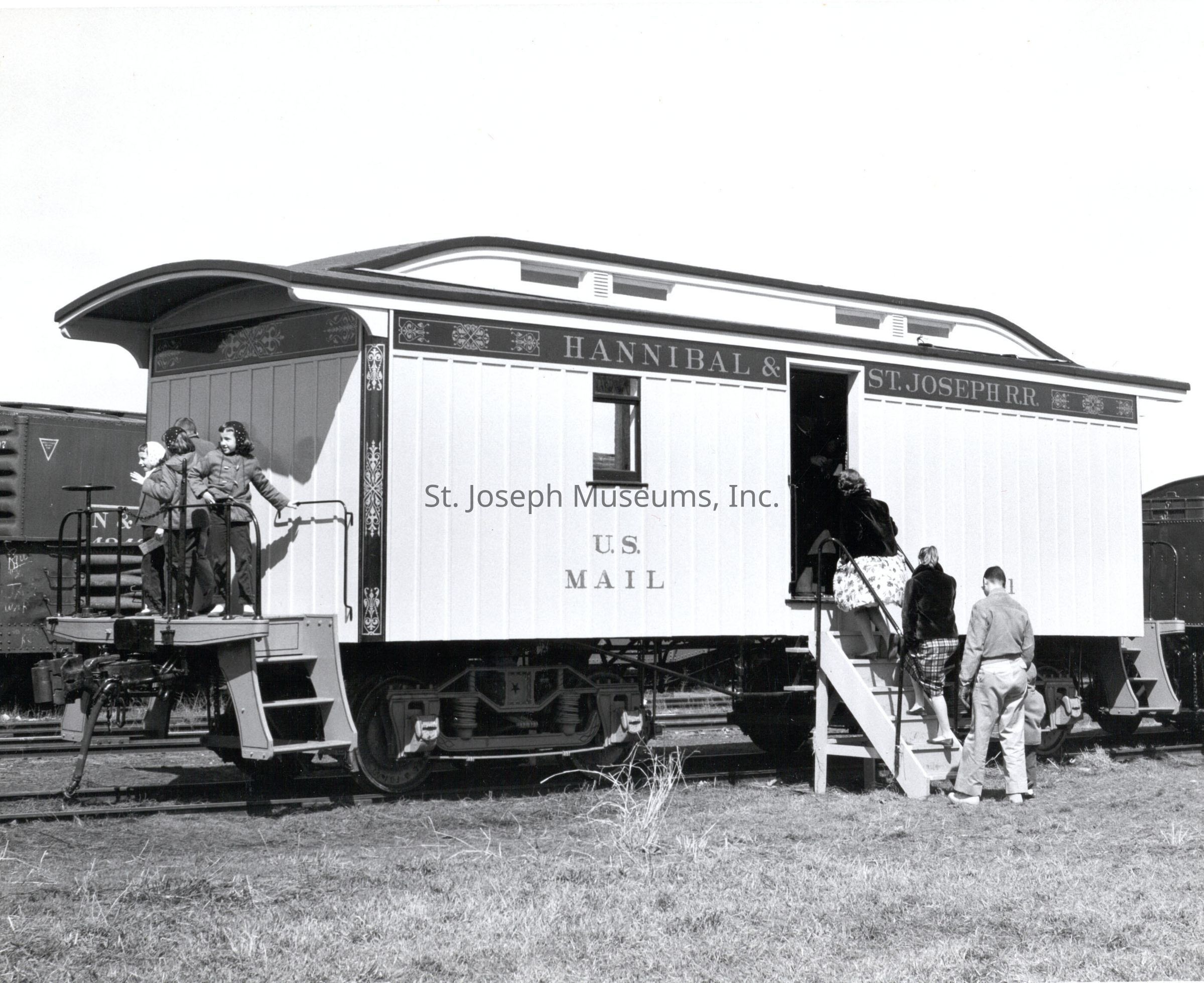 96.1P.6 = Rail car, light colored, on track, being visited by locals. "Hannibal & St. Joseph RR. at top. U.S. Mail on side. "Pony Express Centennial. Replica of First Hannibal & St. Joseph RR Mail Car.", April, 1960.