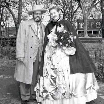 96.1P.10 = Photo of man in period costume with Centennial Queen who is dressed in 1890's ball gown. "Joseph Sturek & Maryon Kay Derc."