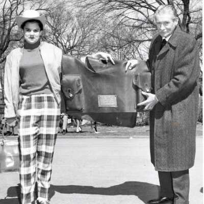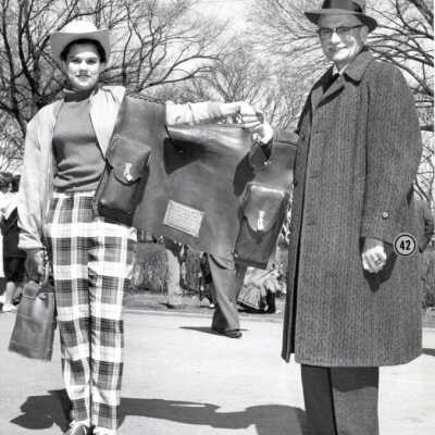96.1P.14 & 15 = Young woman in plaid slacks, holding hands with man in top coat & hat. Their arms are linked under the mochila. "Adrian Gum, President of St. Joseph Stamp Club and his daughter, Marcia, with mochila filled for re-ride, April, 1960"
