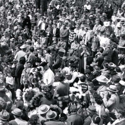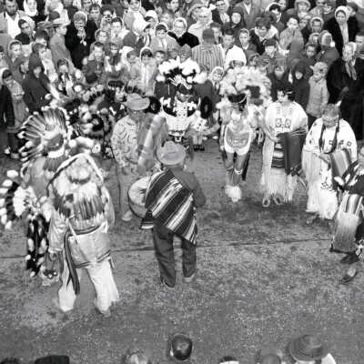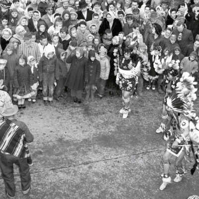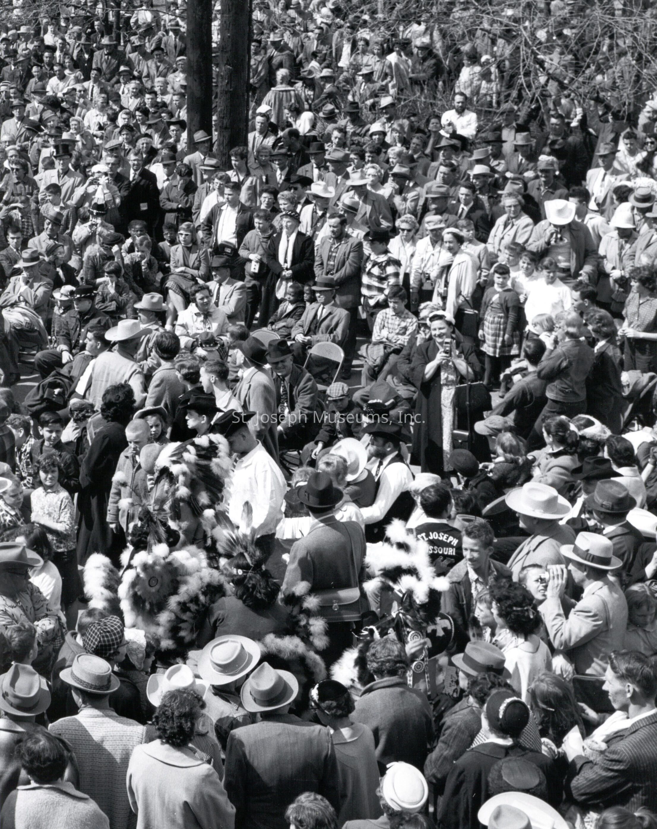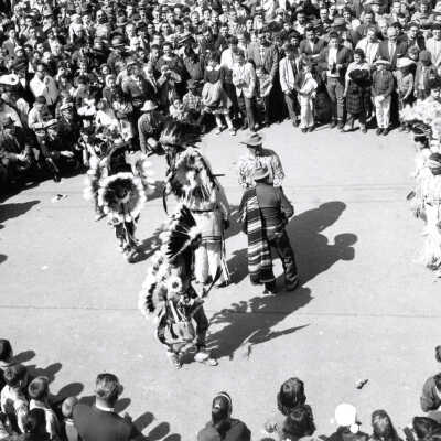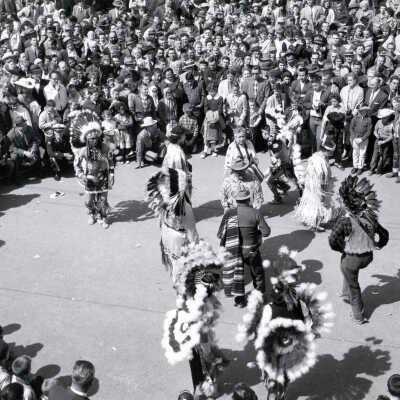 96.1P.18-21 = Huge crowd surrounds circle of Native American Dancers in ceremonial dress. "Indian Tribal dancing at Pony Exp. Centennial, April 3, 1960." Iowa and Omaha Indians.