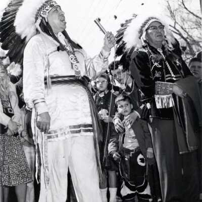 96.1P.22 = Two Native American men in ceremonial dress with full headdress. One is speaking into microphone. "Chief White Eagle & 'Chief' Frank Dupuis"