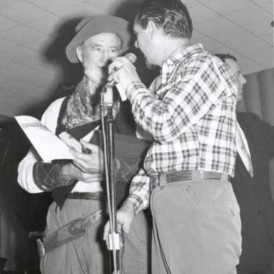 96.1P.23 = Man in whiskers (Gene Ruddy), dressed in period costume, at microphone with unidentified man. "Whisker Champ" of contest at Pony Express Centennial Ball.