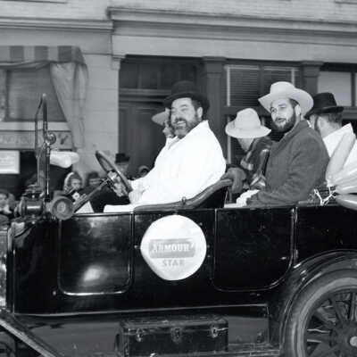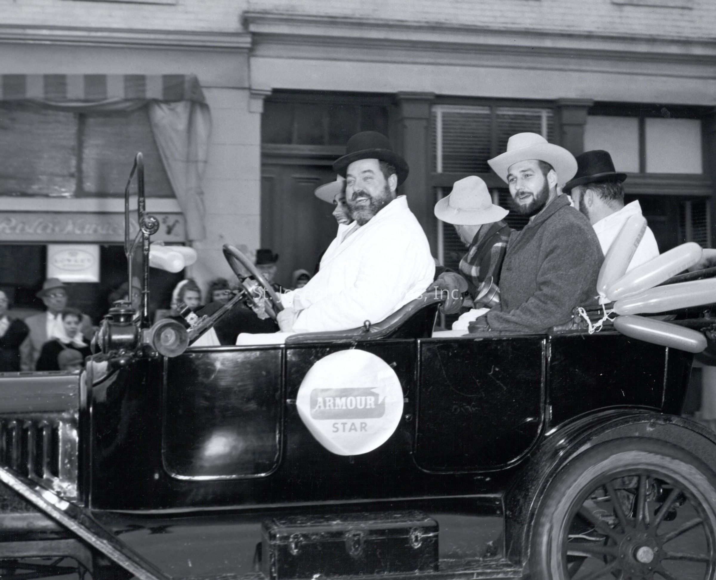 96.1P.24 = Men riding in open top car, c. 1900 vintage, in Pony Express Centennial parade. "Armour Star" sign on side of car.