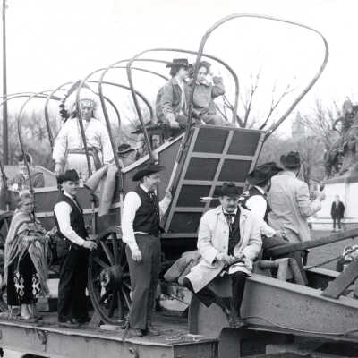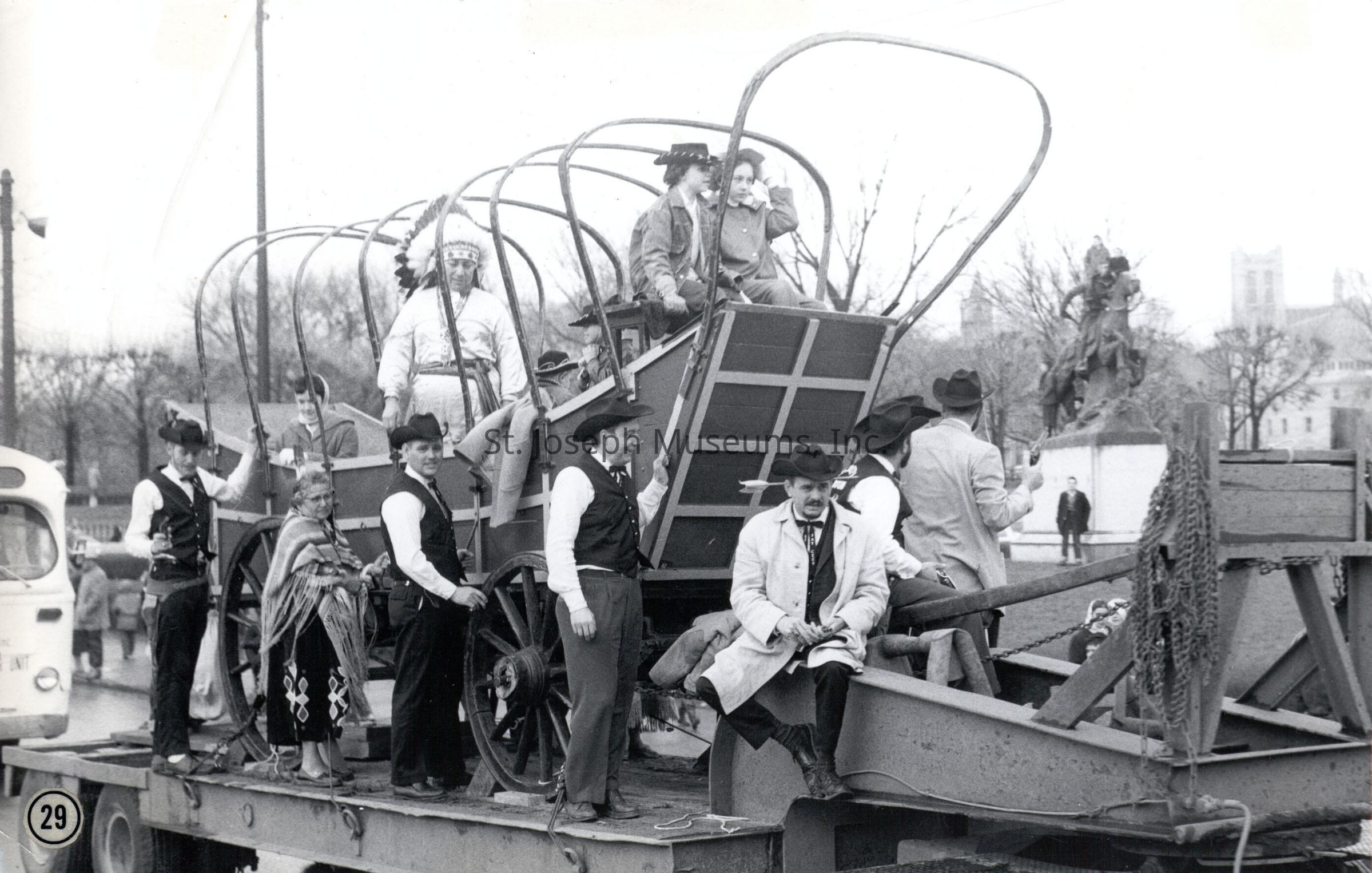 96.1P.25 & 26 = Men in western attire with cowboy hats, Native American couple wrapped in blankets, standing on parade float with covered wagon behind them. Two girls are sitting on wagon seat. The wagon spines are visible without canopy top. April 2, 1960.
