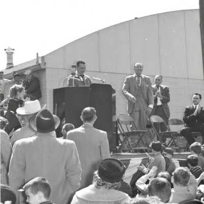 96.1P.27-29 = Speaker on dias, Man in top hat & tails approaching him. Crowd seated or standing below dais. Pony Express Bowling Lanes in background. "Pony Express Centennial Ceremony" April 3, 1960.