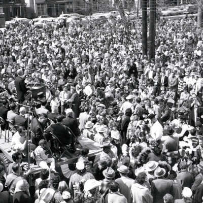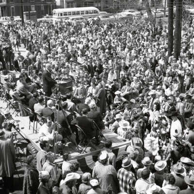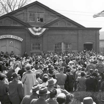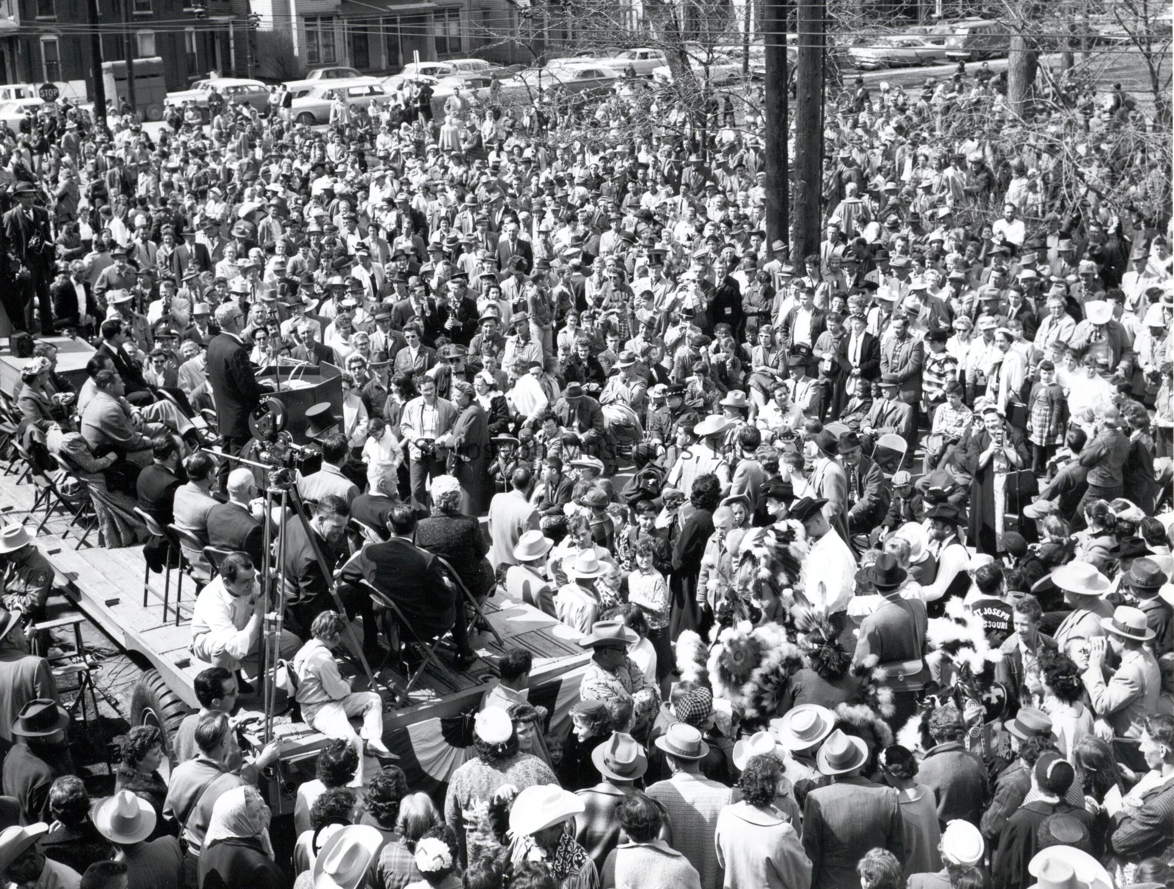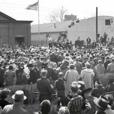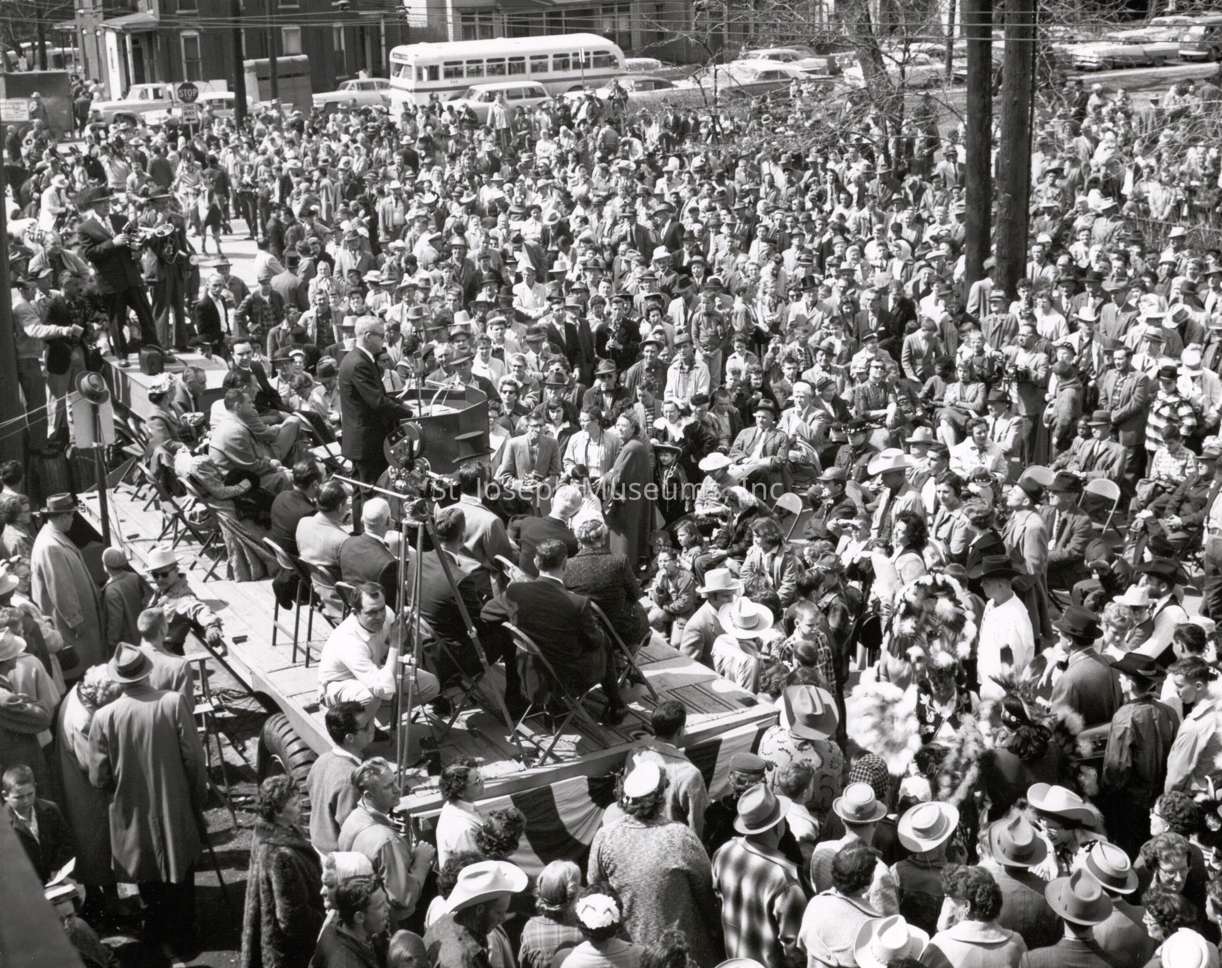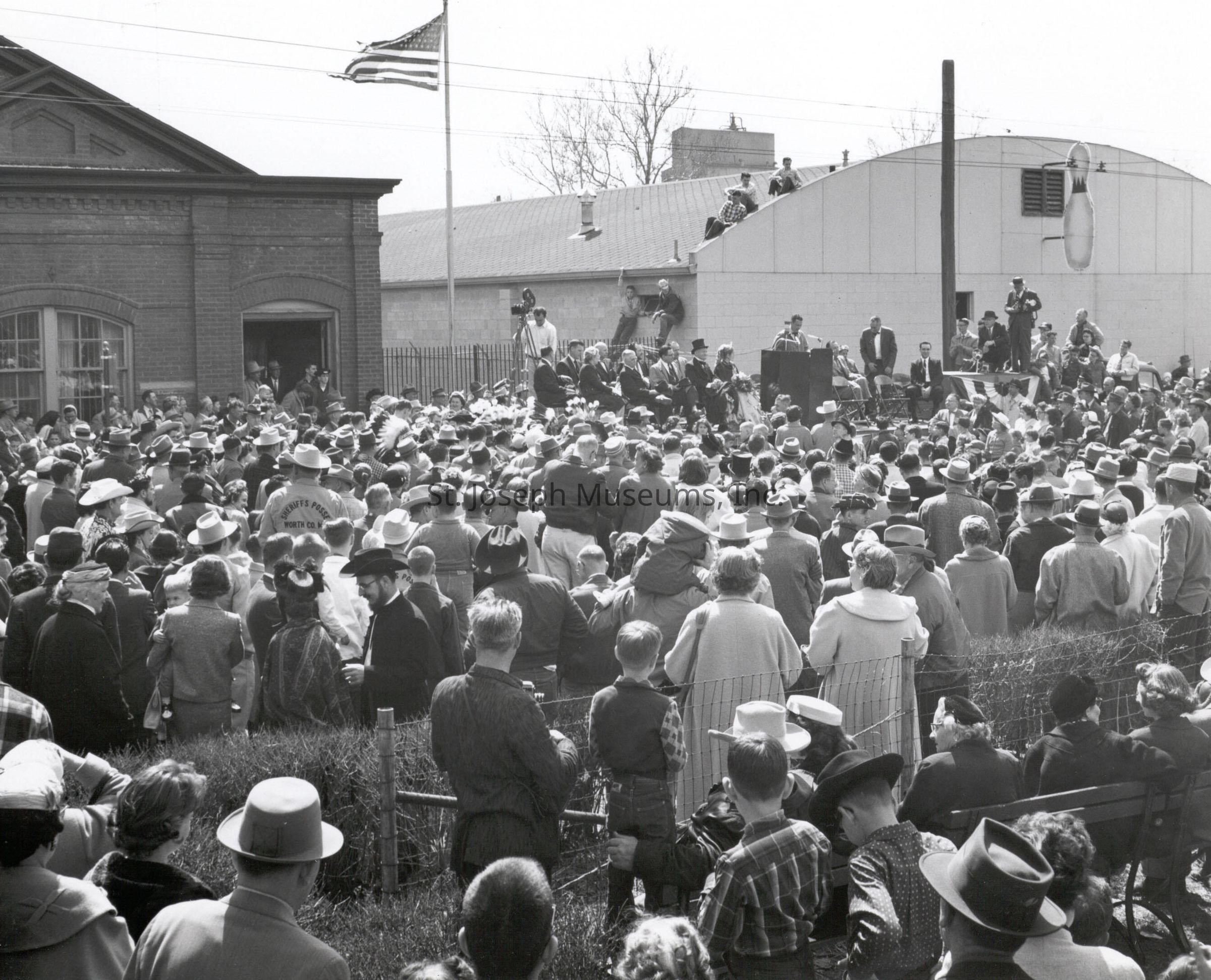96.1P.32-34 = Almost aerial view of huge crowd gathered in Patee Park in front of dais at ceremonies on April 3, 1960 outside Pony Express Stables.Lexicon