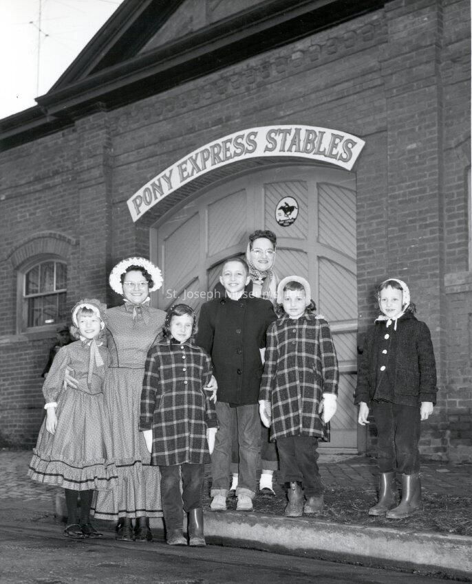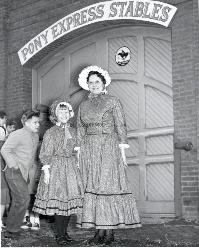 96.1P.3 = Women and children posed at door of Pony Express Stables. One woman and girl in period dress are Mrs. Roy Coy & daughter Barbara.