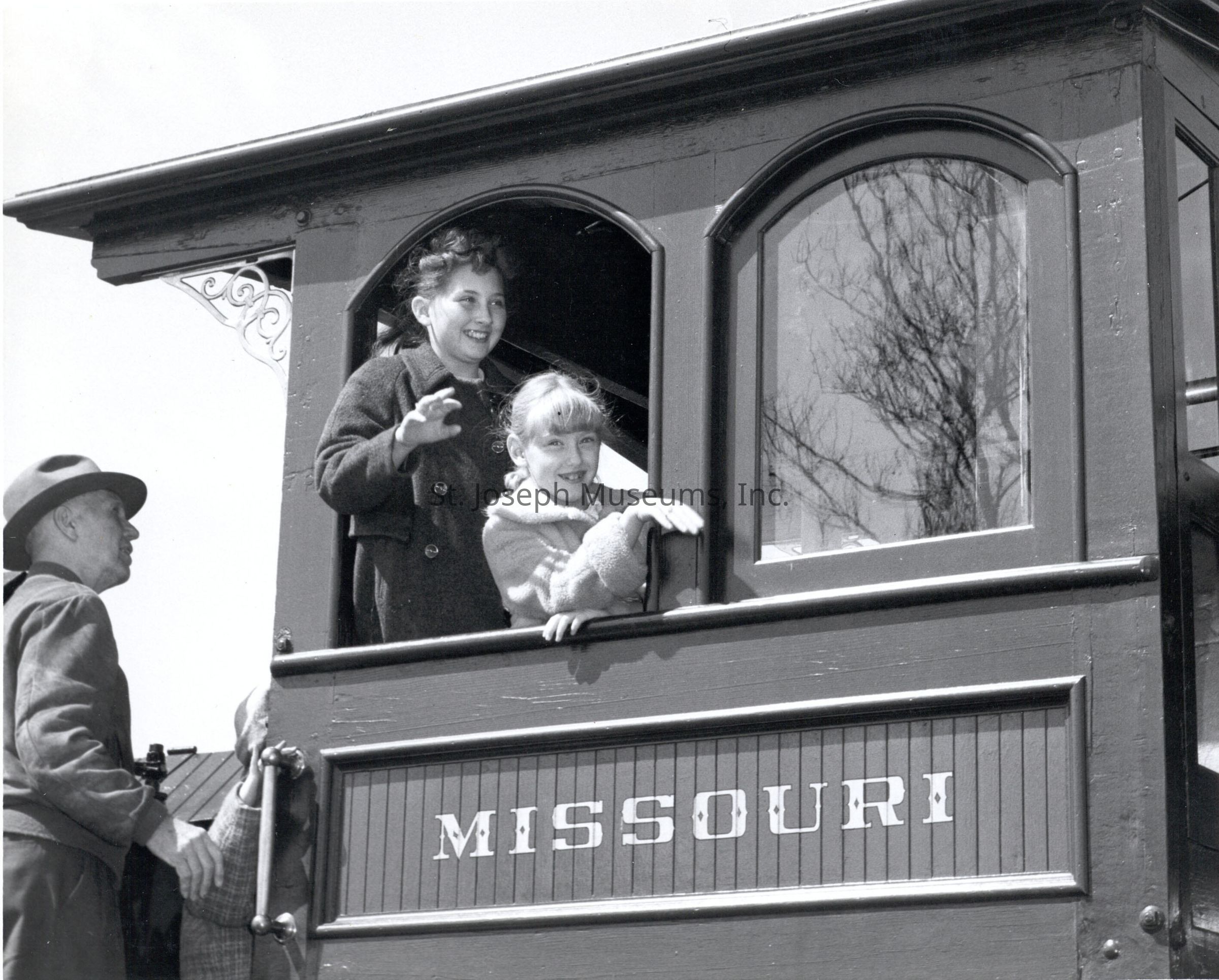 96.1P.7 = Two girls waving from window of Railroad Engine, "Cab of Burlington Engine #35"
