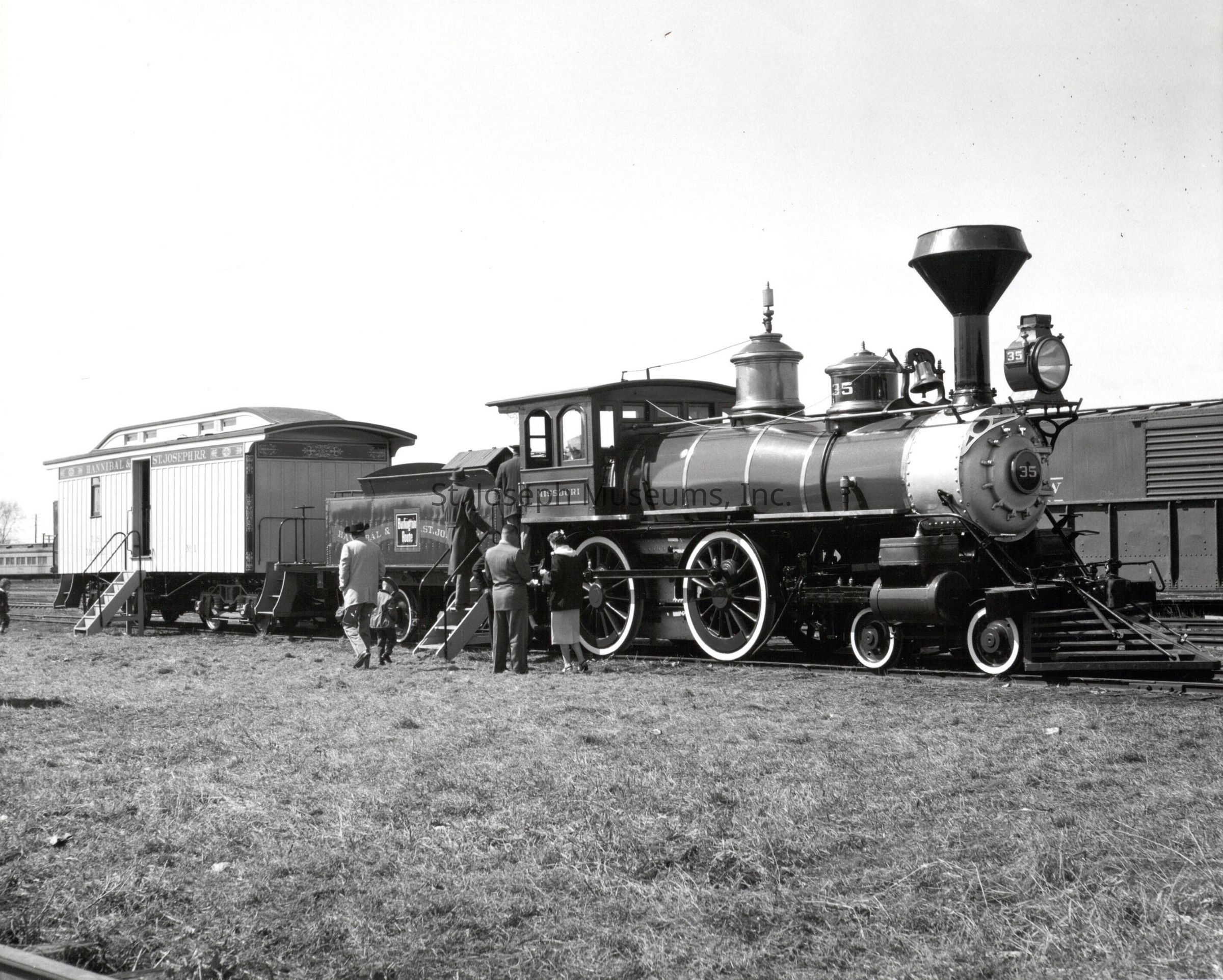 96.1P.8 = Full length view of Burlington RR Engine #35, parked on track as exhibit for Pony Express Centennial. Visitors climbing off car, Others taking pictures of those posed beside.