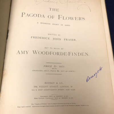 “Pagoda of Flowers: A Burmese Story in Song” songbook by Fredrick John Fraser and set to music by Amy Woodforde-Finder.