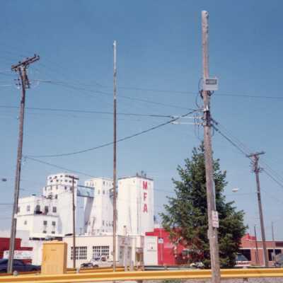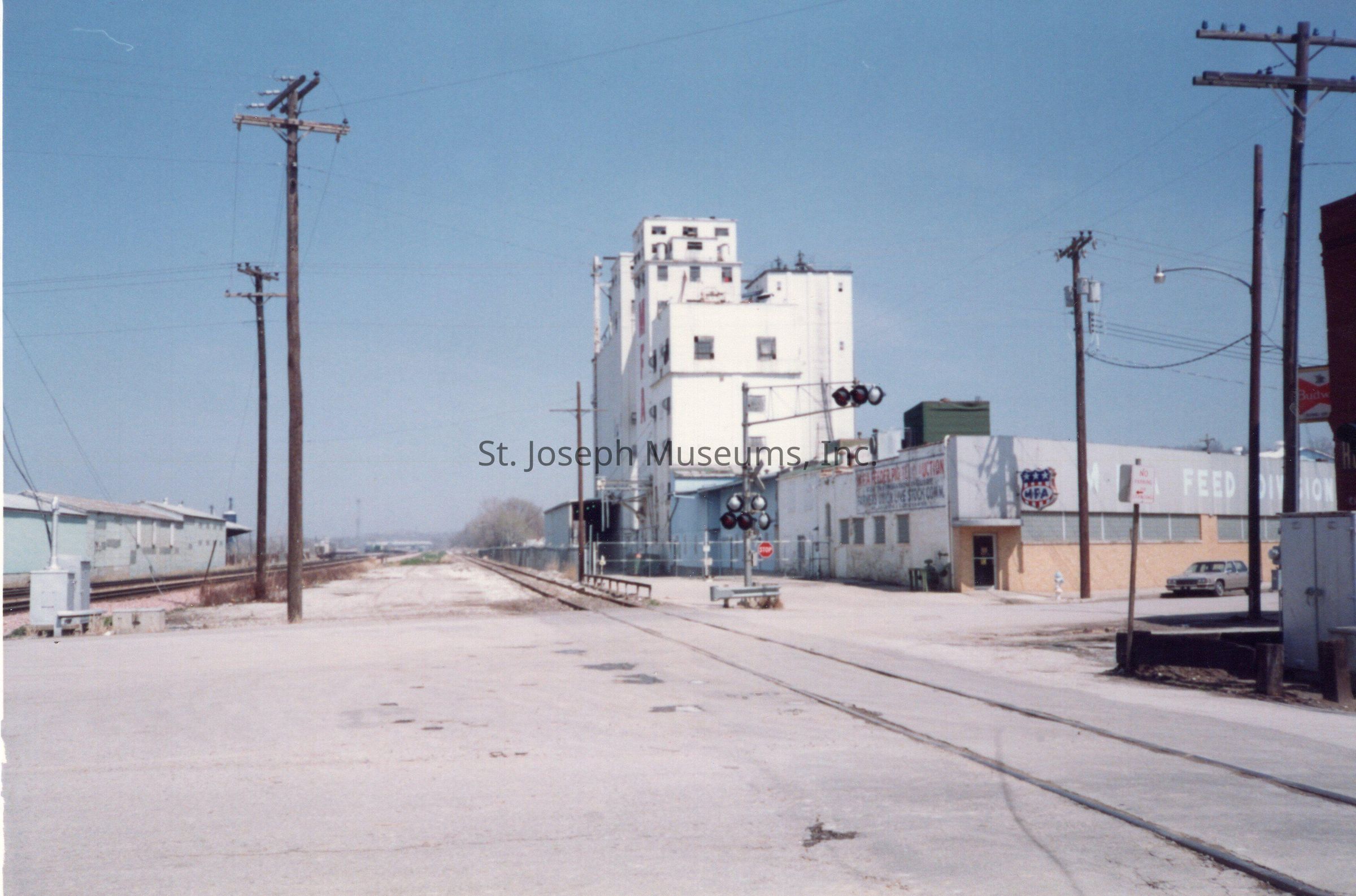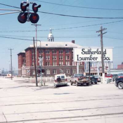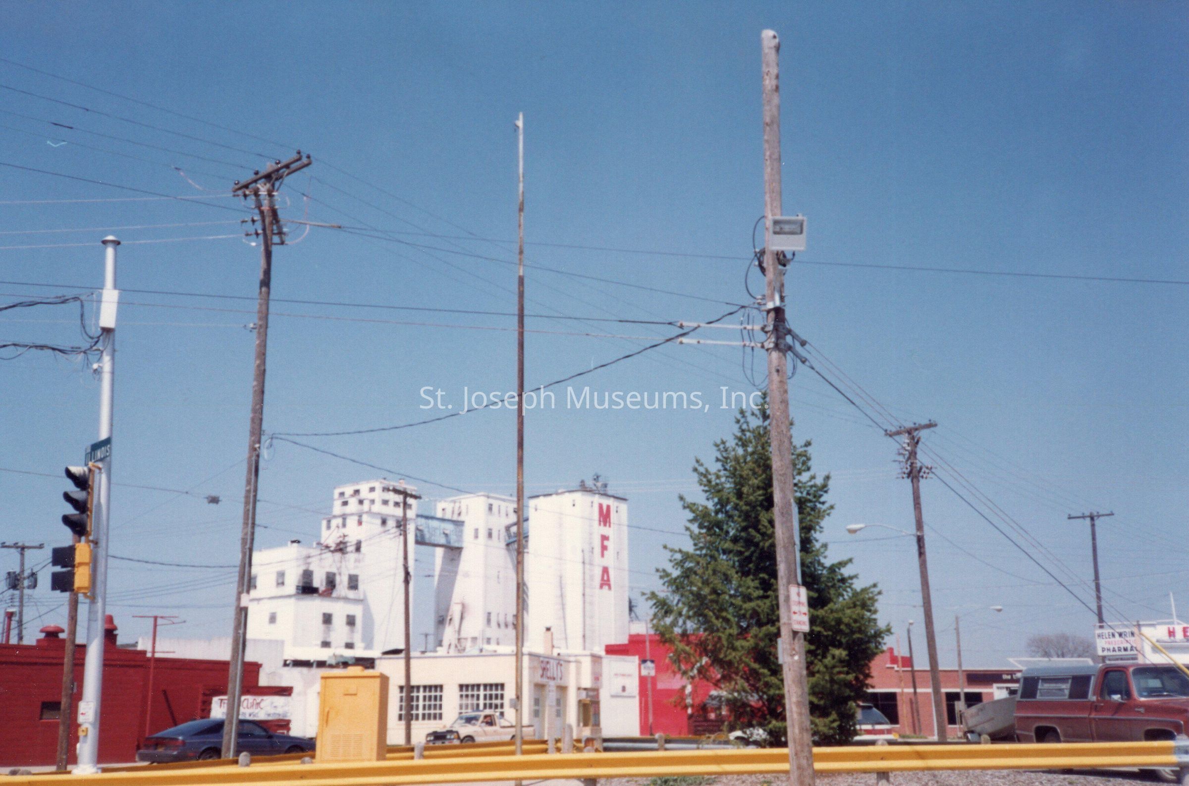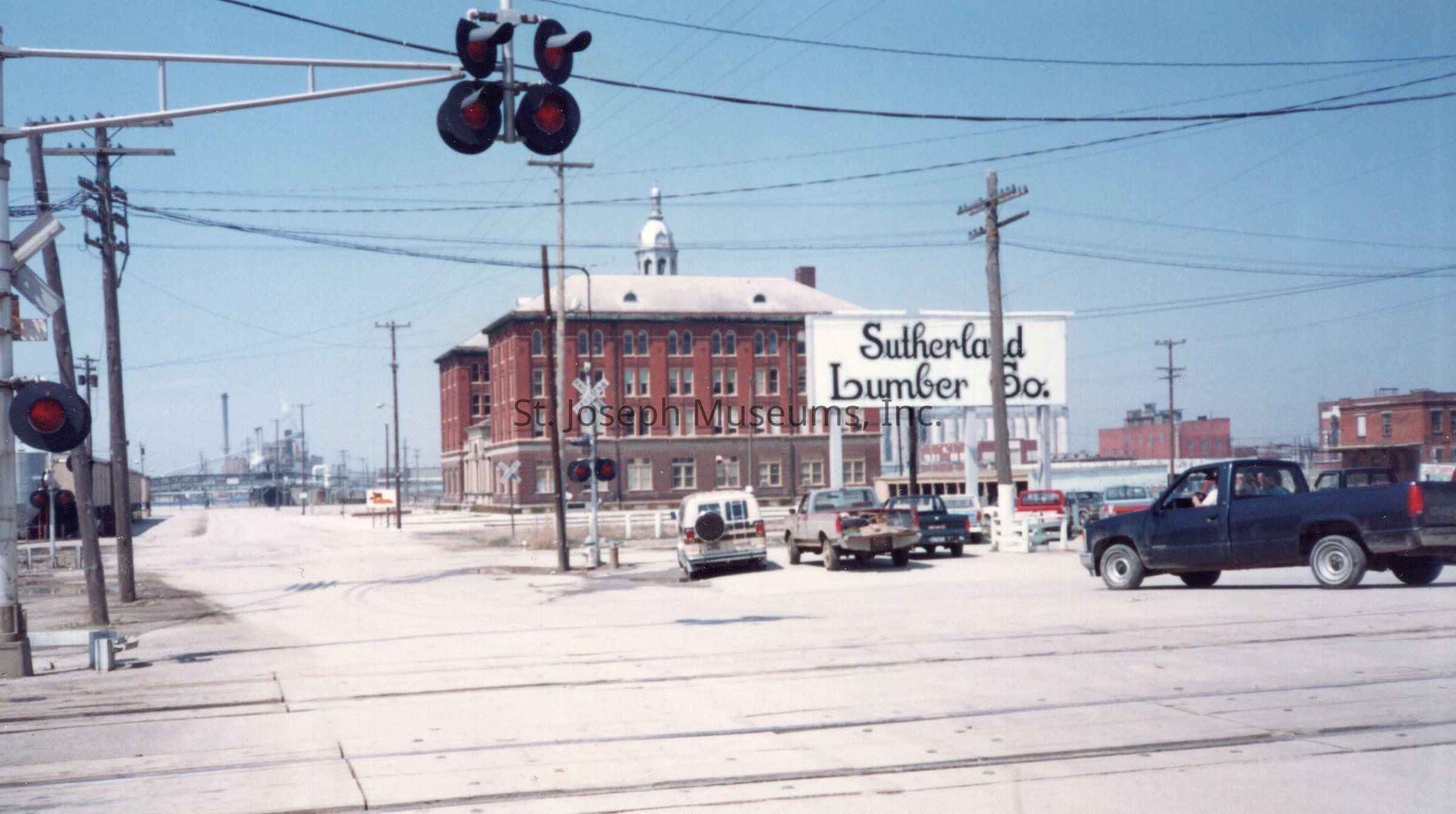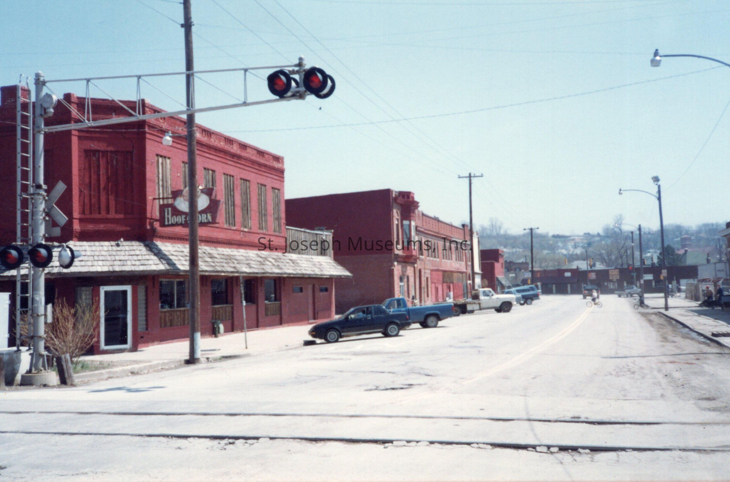 Southside Streets & Businesses Snapshots (6), c. 1990. color. Six photos taken in South St. Joseph area along King Hill Avenue, Illinois Avenue, Missouri Avenue, Cherokee Street. They include views of Livestock Exchange Building, Sutherland Lumber Company, Hoof n Horn Restaurant, MFA Mill.Collection