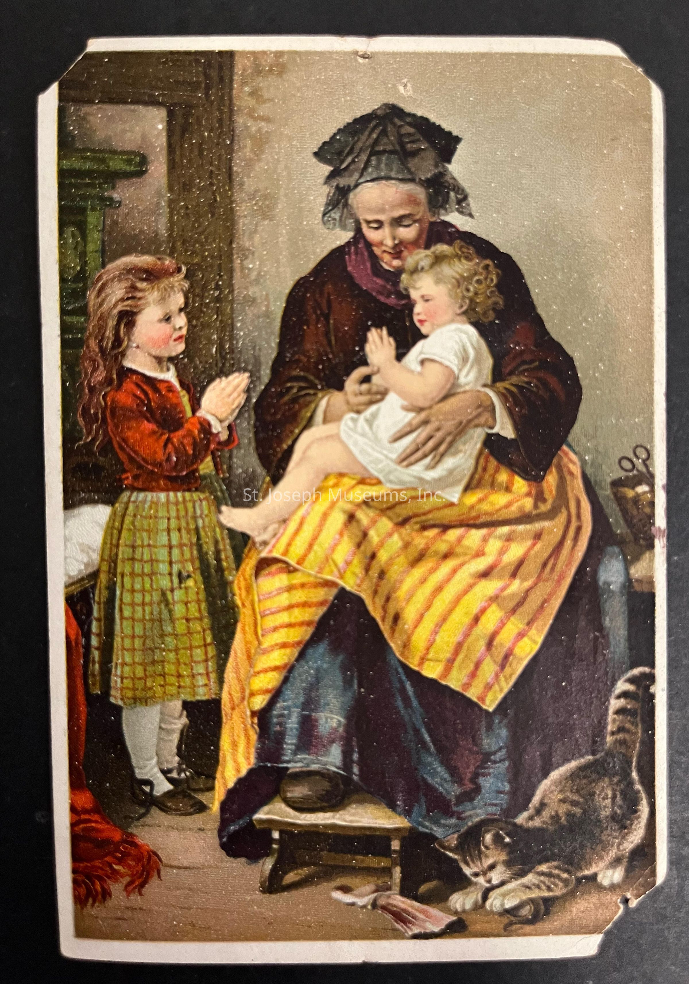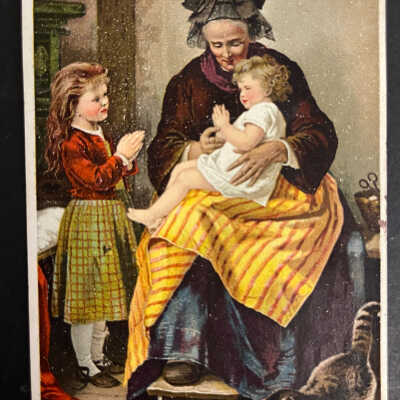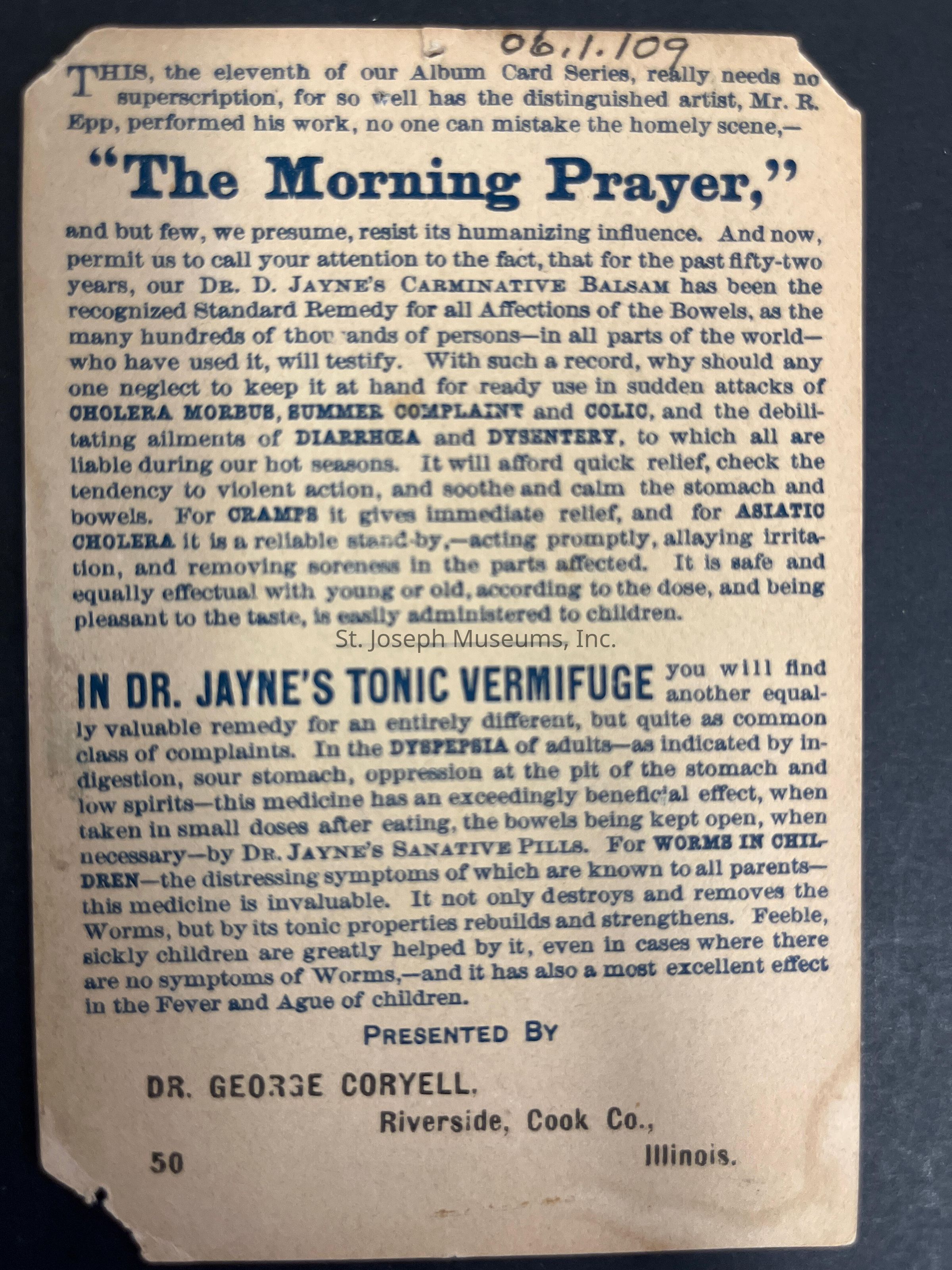 Color premium card for Dr. George Coryell - Dr. Jayne's Tonic Vermifuge - Chicago, Illinois. c. 1910 Color Illustration "The Morning Prayer" by R. Epp.