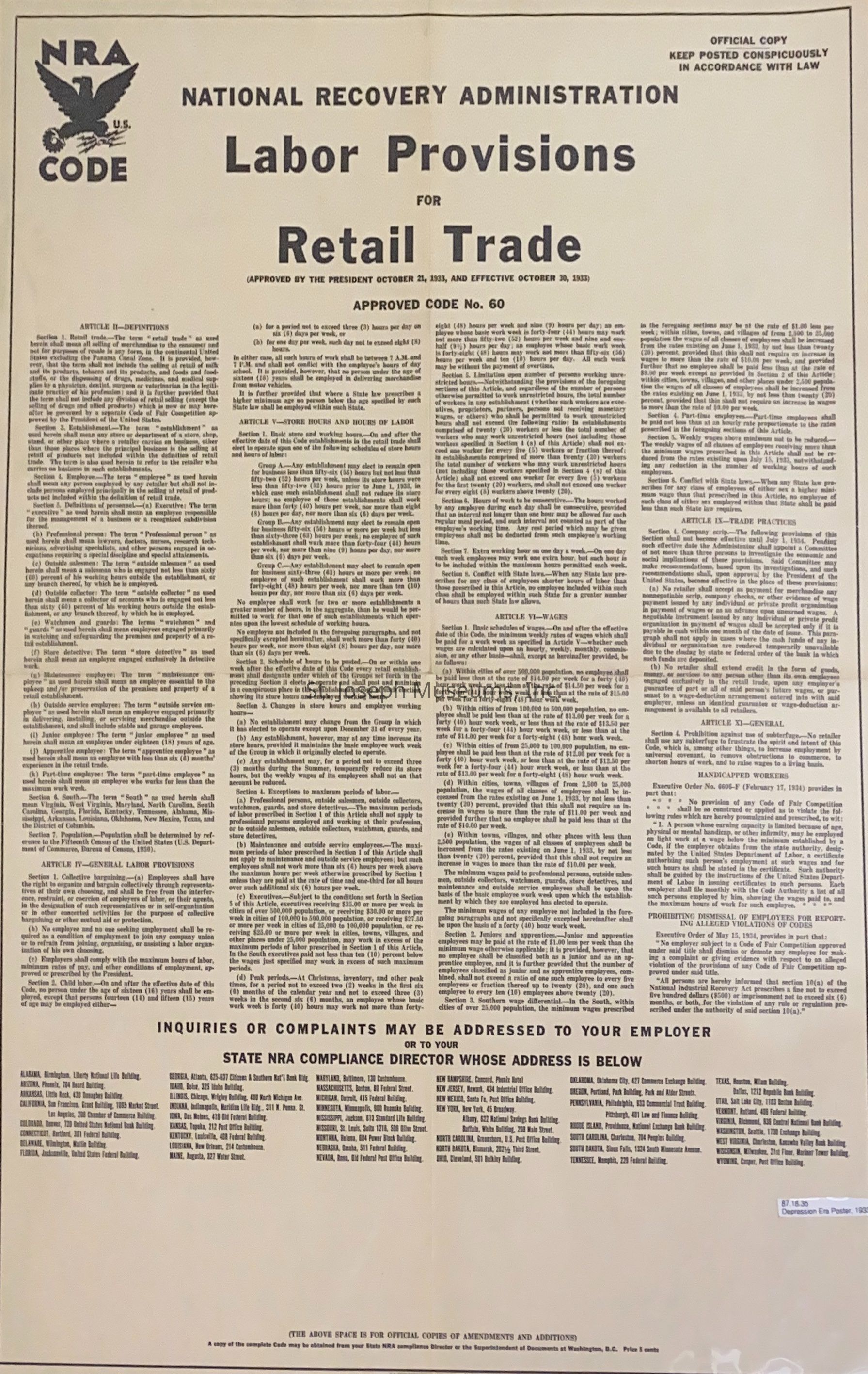Inquiries or complaints may be addressed to your employer or to your state NRA compliance director. Dated October 1933.Lexicon