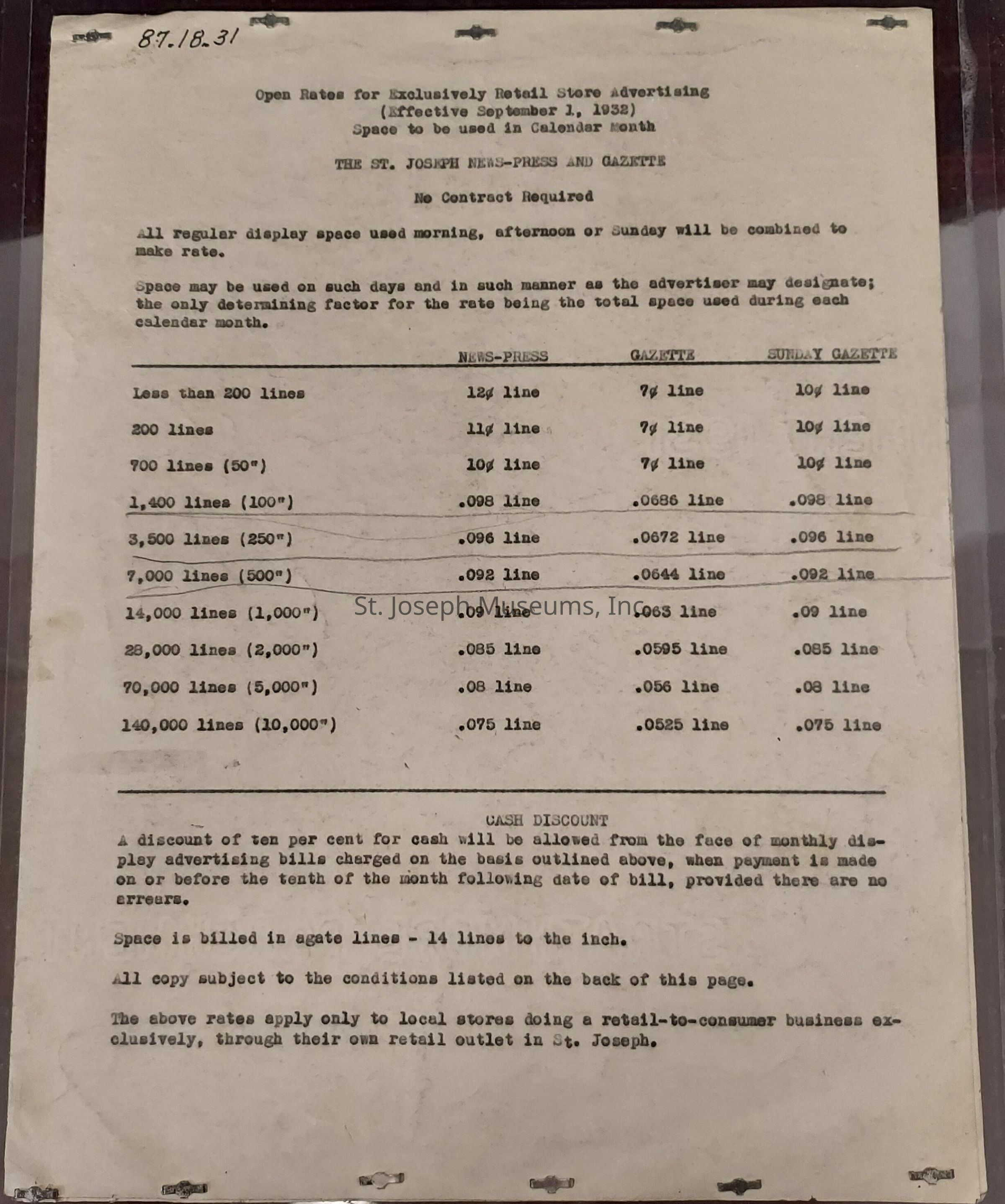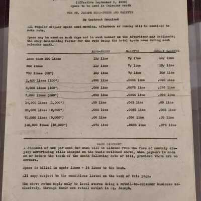 Conditions Governing The Sale Of Open Space Advertising To Local Retail Store Advertisers In The St. Joseph News-Press And Gazette, 1932. This booklet has the rates for retail store advertising effective September 1, 1932.