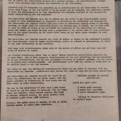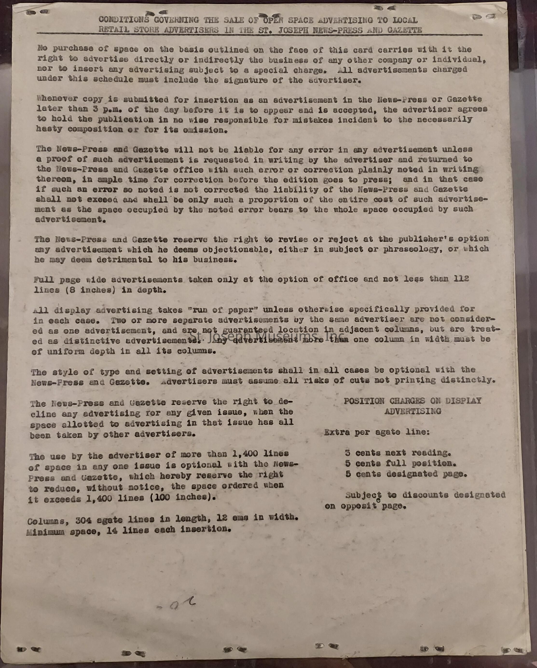 Conditions Governing The Sale Of Open Space Advertising To Local Retail Store Advertisers In The St. Joseph News-Press And Gazette, 1932Entry/Object ID