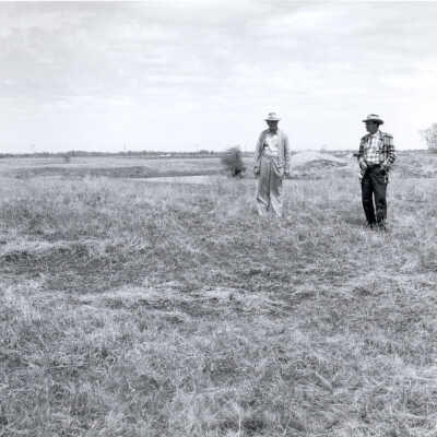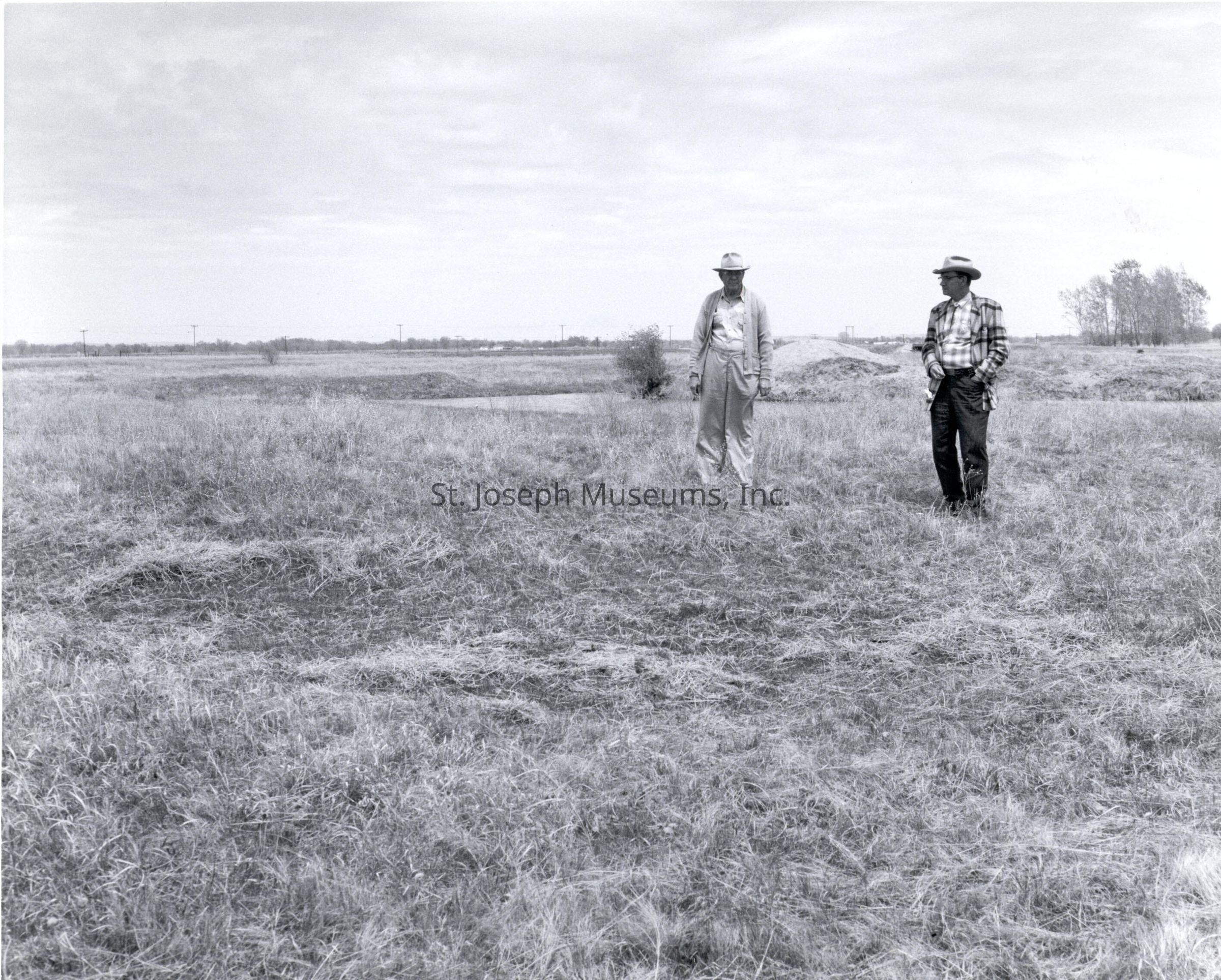 95.1P.394 = Two men standing in grassy field. a sunken circle at their feet barely visible. Legend : "Sod house ruin at Cold Springs Station Site."